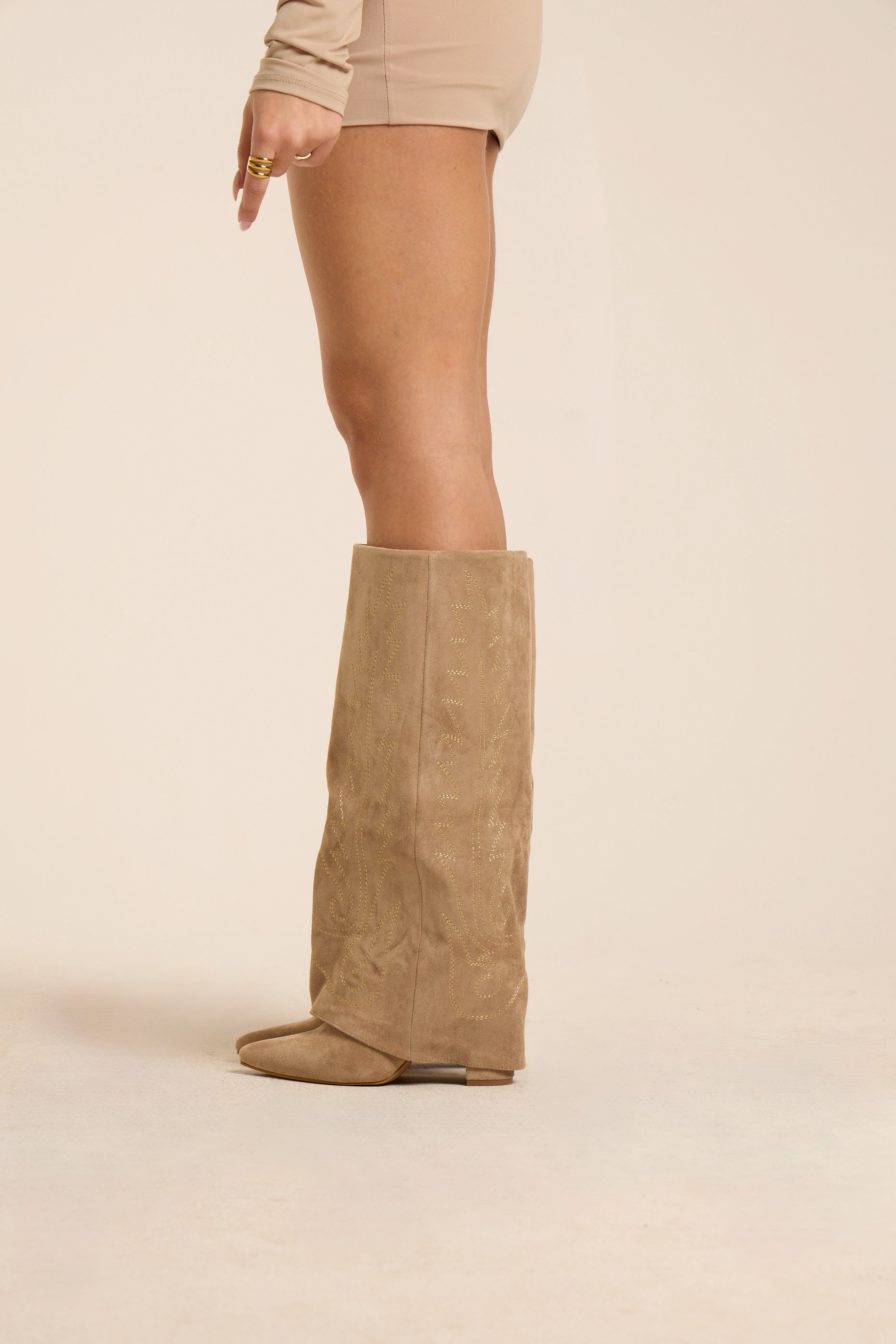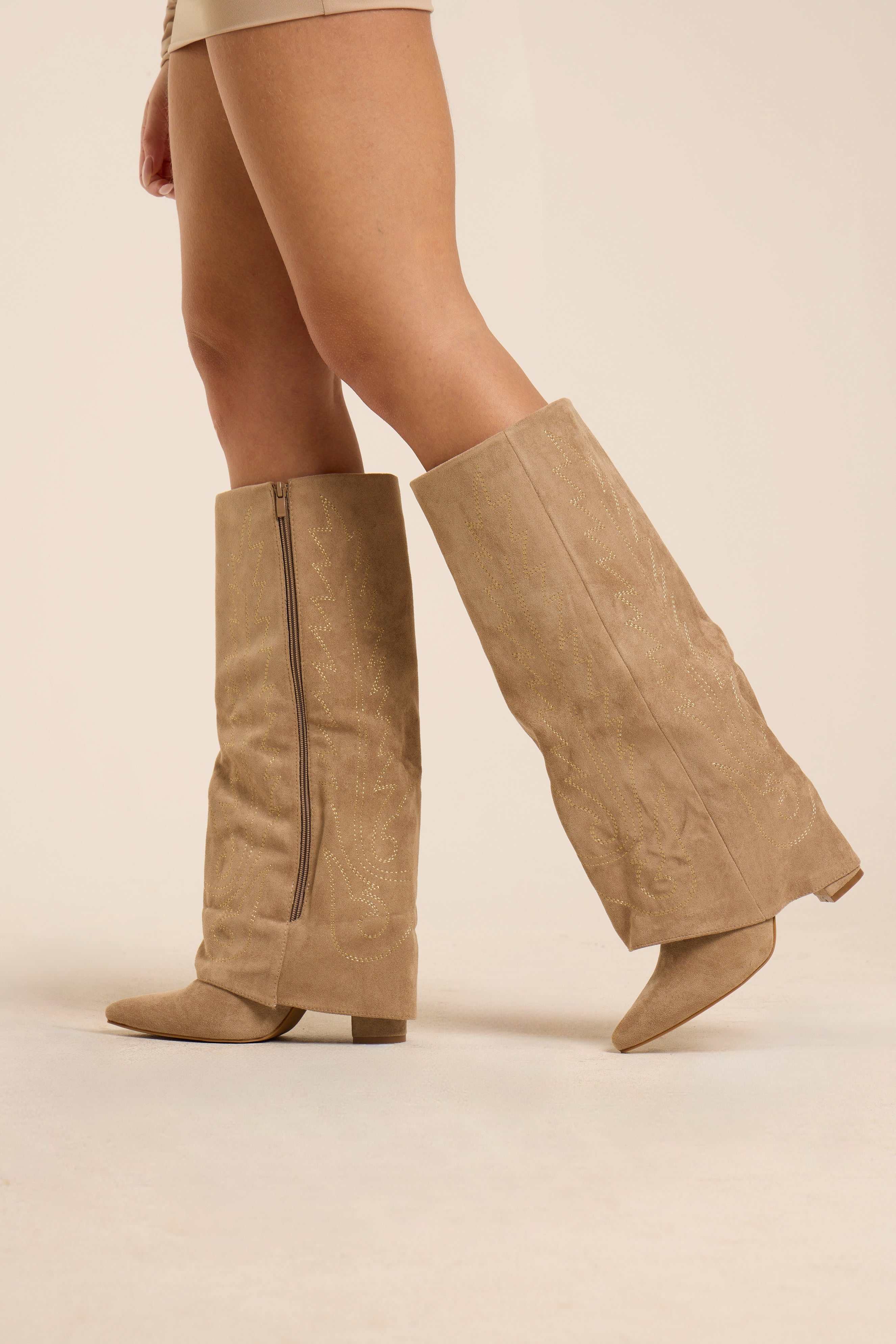 Stivale alto in suede beige con ricami tono su tono. Linea dritta e femminile, punta affusolata e tacco basso per un comfort quotidiano. Chiusura laterale con zip per una calzata pratica. Un modello versatile, ideale per look casual-chic.