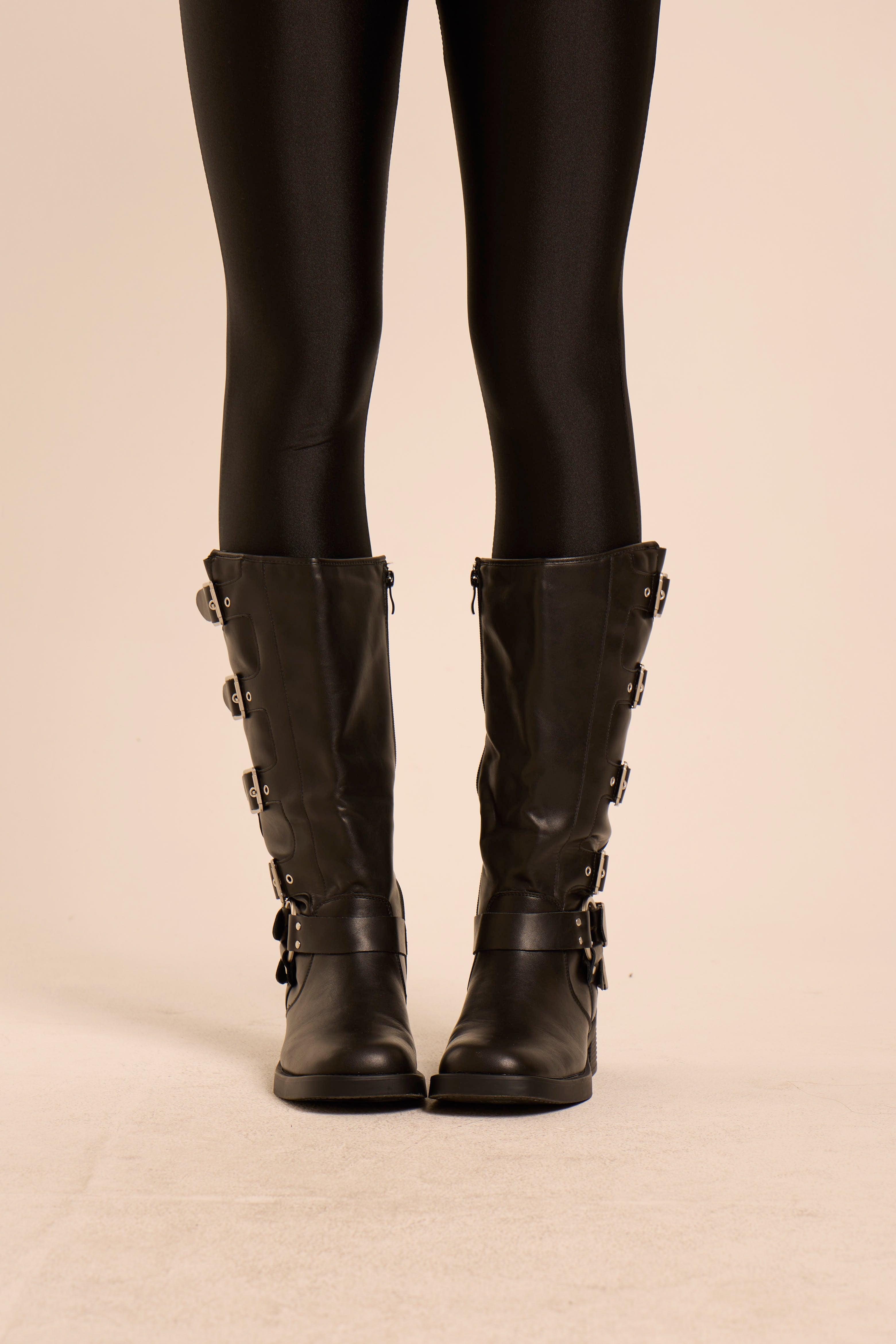 Stivali neri con multiple fibbie metalliche e tacco stabile. Mood rock e super cool, perfetti per aggiungere carattere.