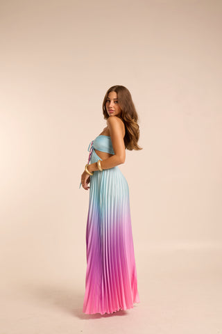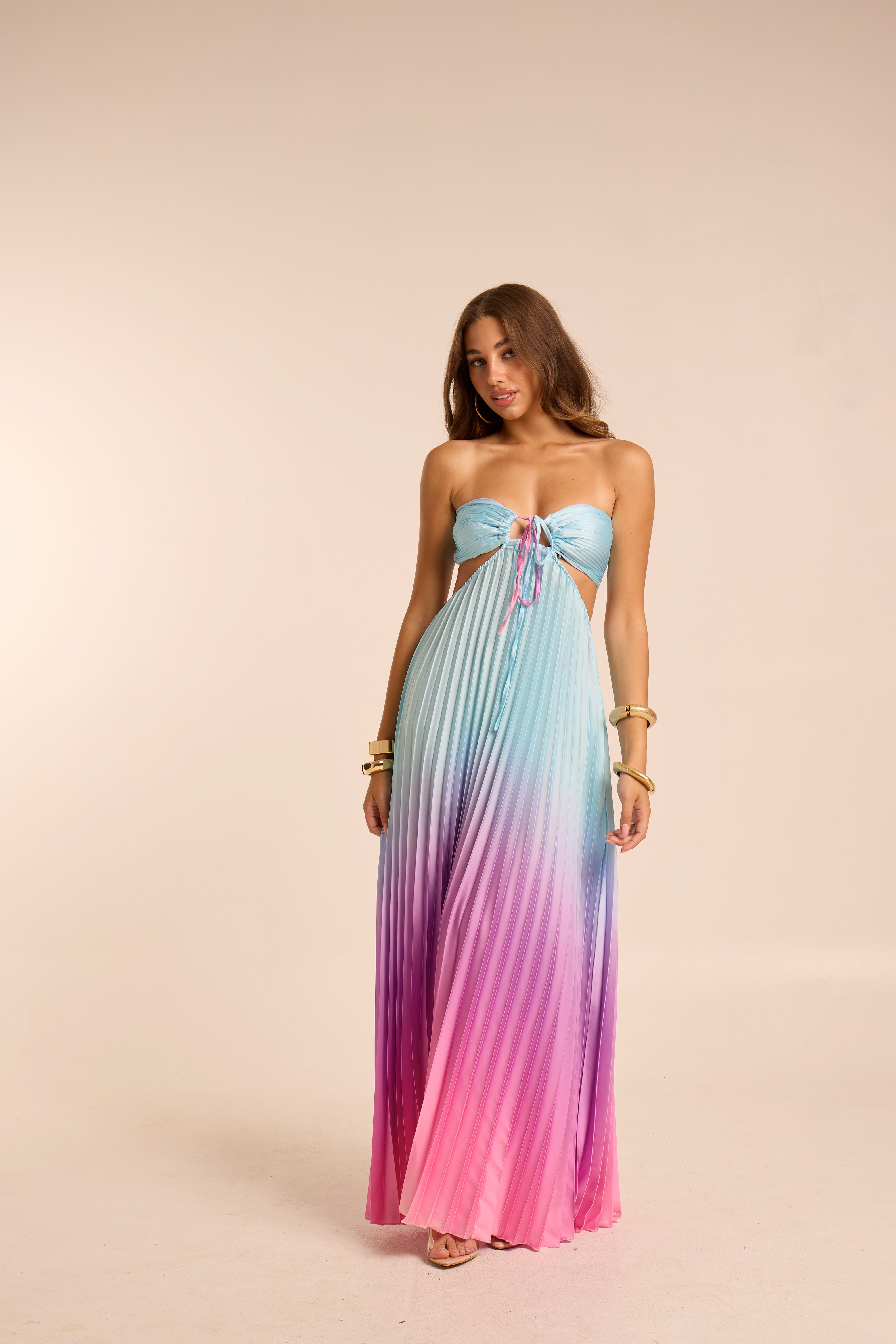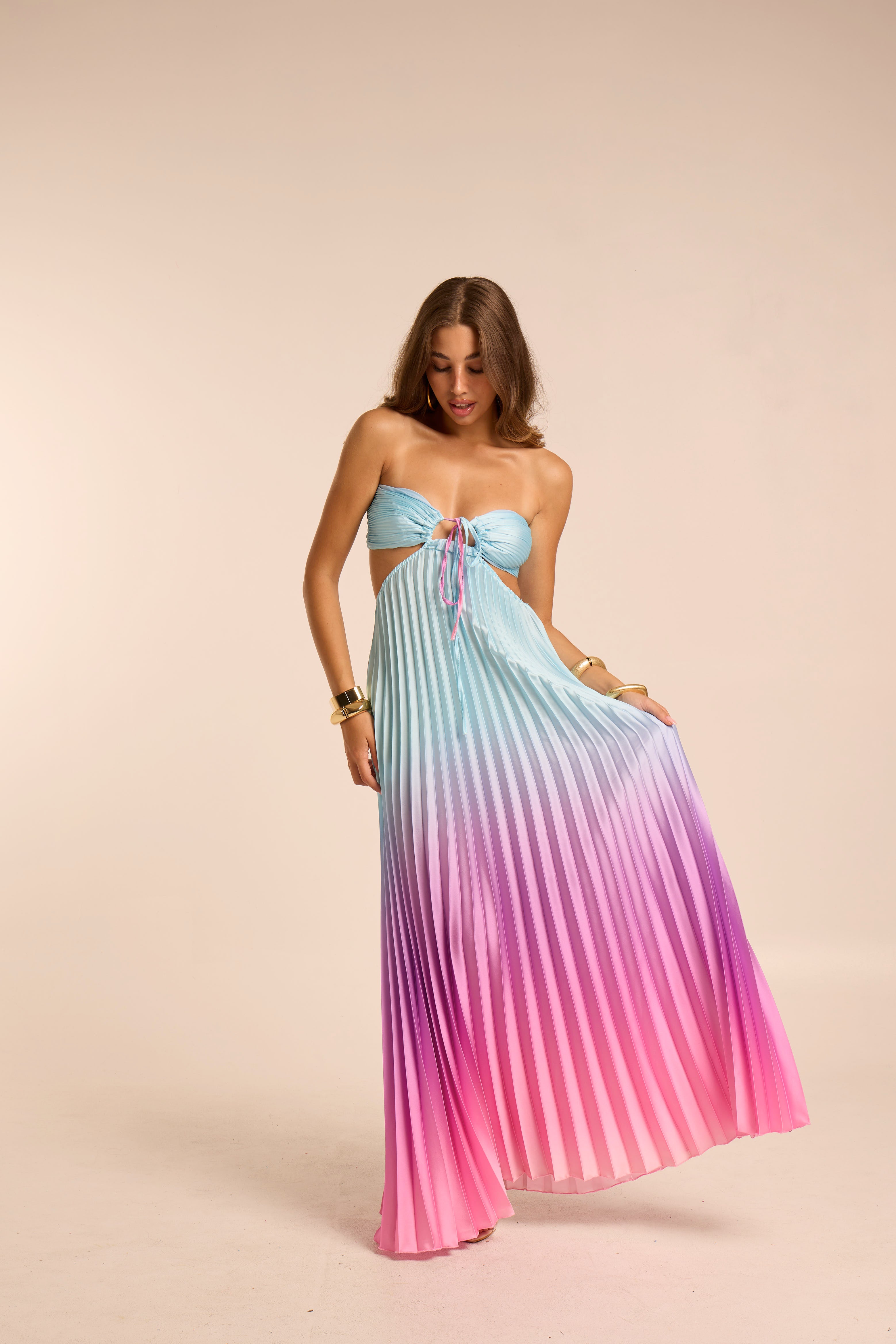 Abito lungo. Leggero. Parte superiore non imbottita, elasticizzata. Dettaglio laccio regolabile. Con schiena scoperta. Cade giù morbido a mini balze.