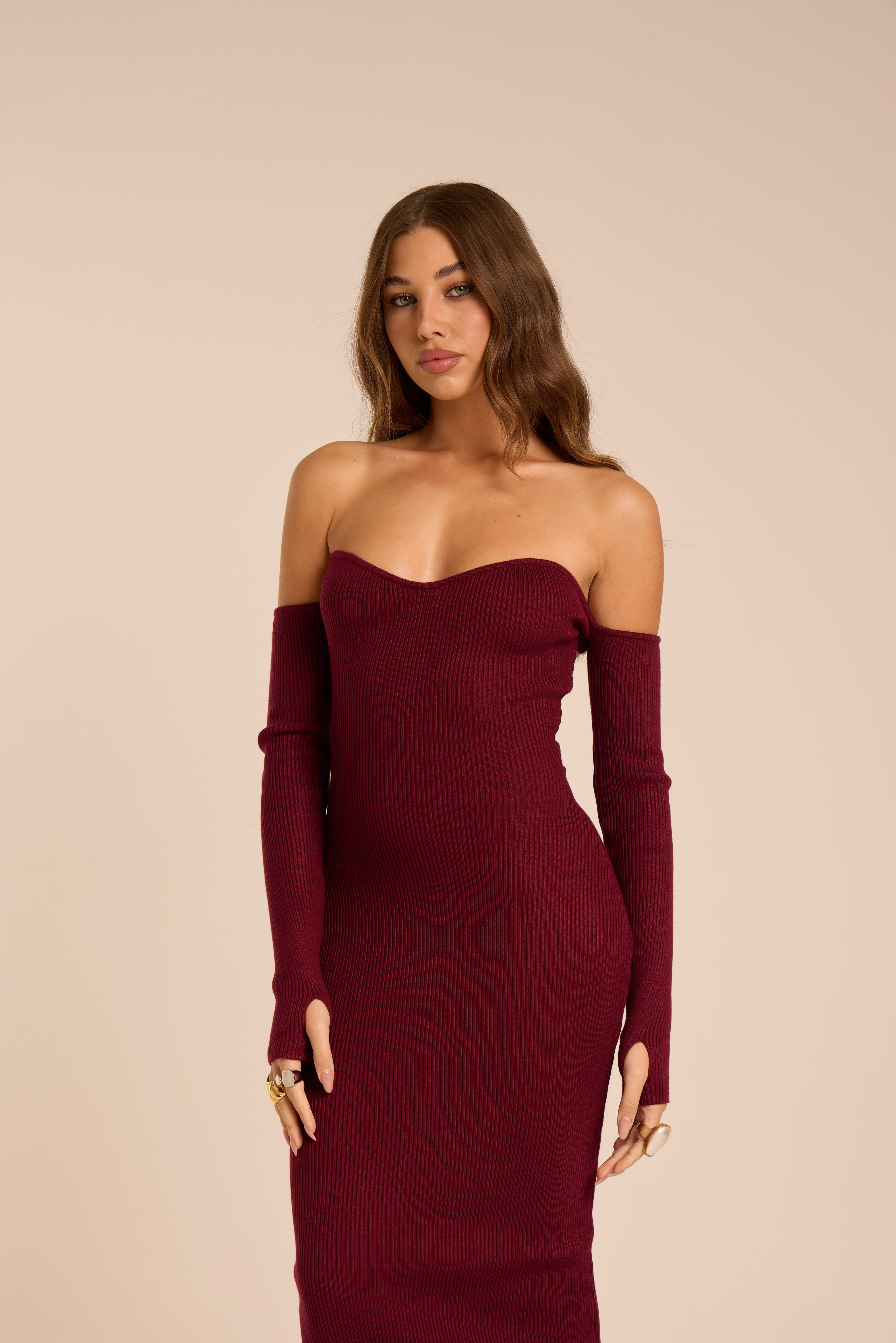 Abito lungo in maglia. A costine. Scollo a cuore. A manica lunga. Fasciante e stretto in vita. Cuciture e rifiniture tono su tono.