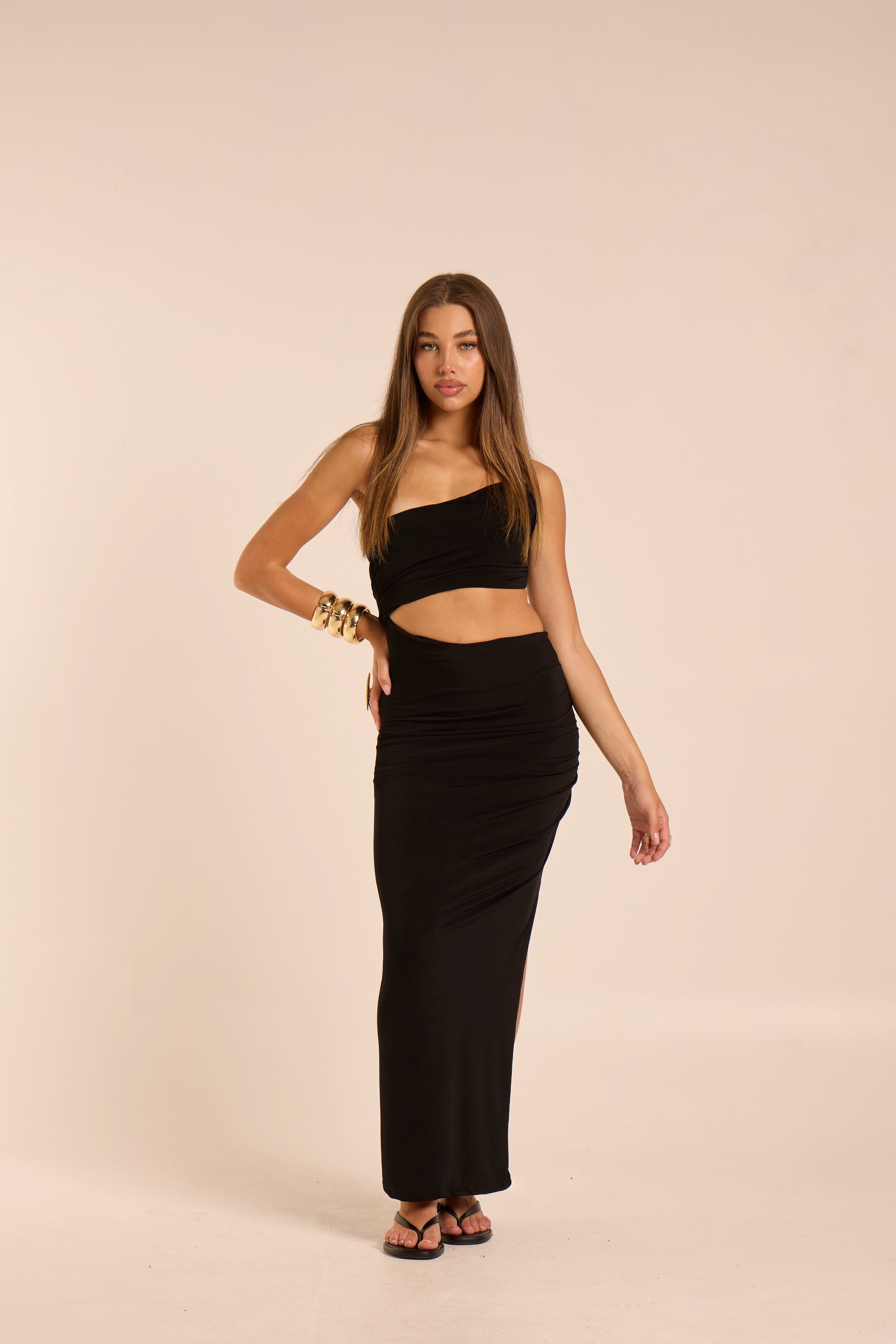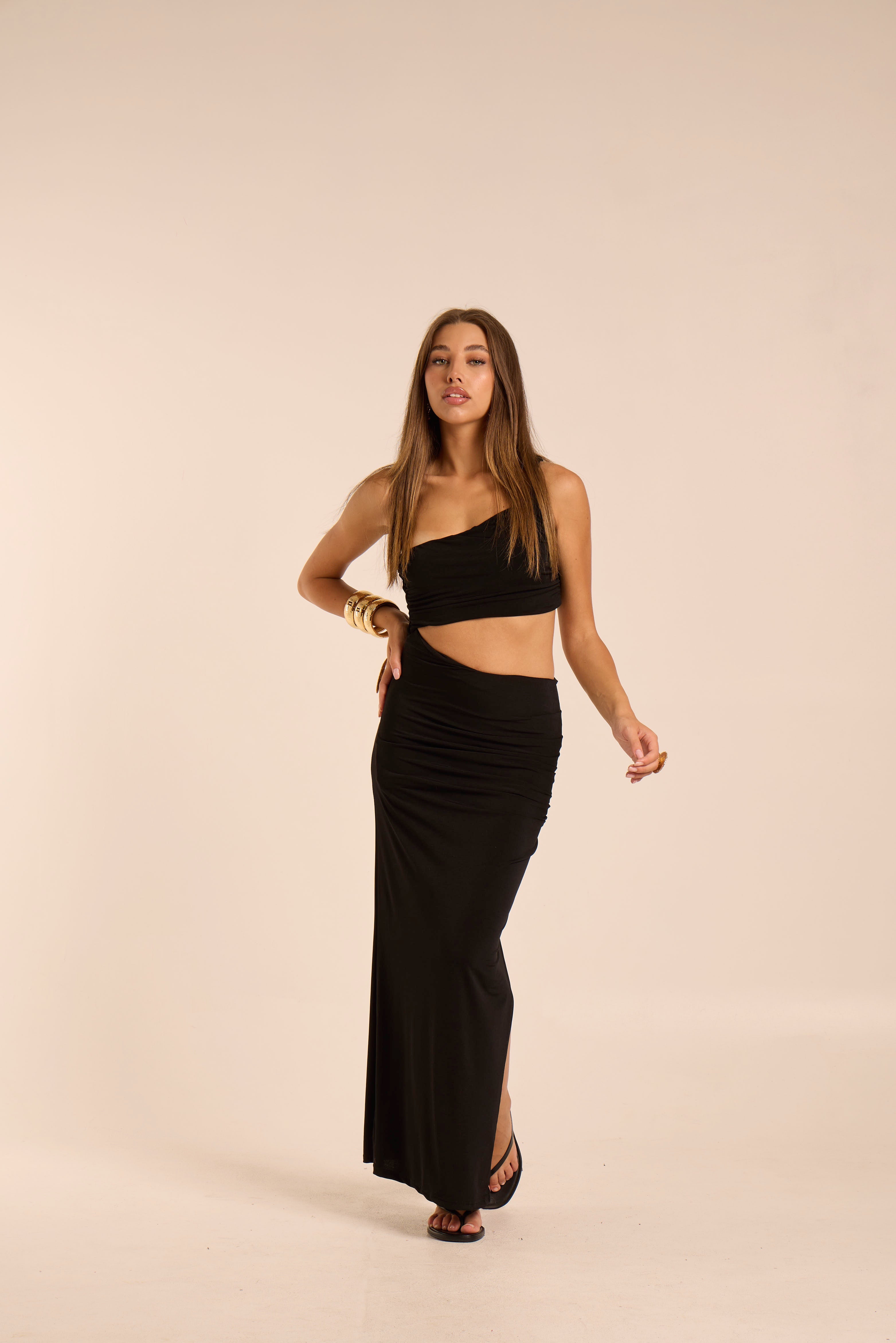 Abito lungo. Dettaglio bretella intrecciata. Spacco parte laterale sul busto. Morbido. Drappeggiato sui fianchi. Cade dritto con spacco laterale.