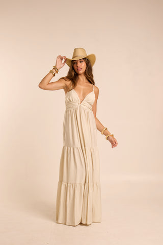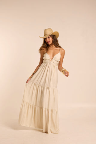 Abito lungo. Leggero. Con busto elasticizzato. Scollo a V, con dettaglio silver. Gonna ampia, a balze larghe.