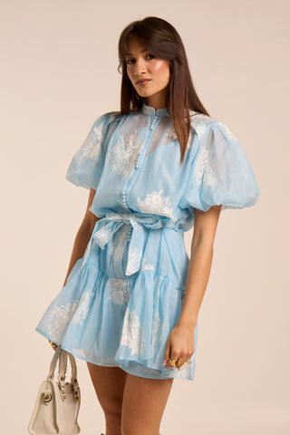 Abito corto. Semitrasparente con sottoveste. Manica mezza misura a palloncino. Ampio in fondo. Chiusura centrale con bottoni tono su tono. Laccio per accentuare punto vita.
