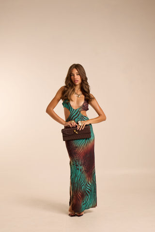Abito lungo. Attillato. Elasticizzato. Allacciatura su collo e schiena. Scollatura parte frontale ad X. Con schiena scoperta. Con spacco laterale basso. Trama zebrata, sui toni dell’azzurro e marrone.