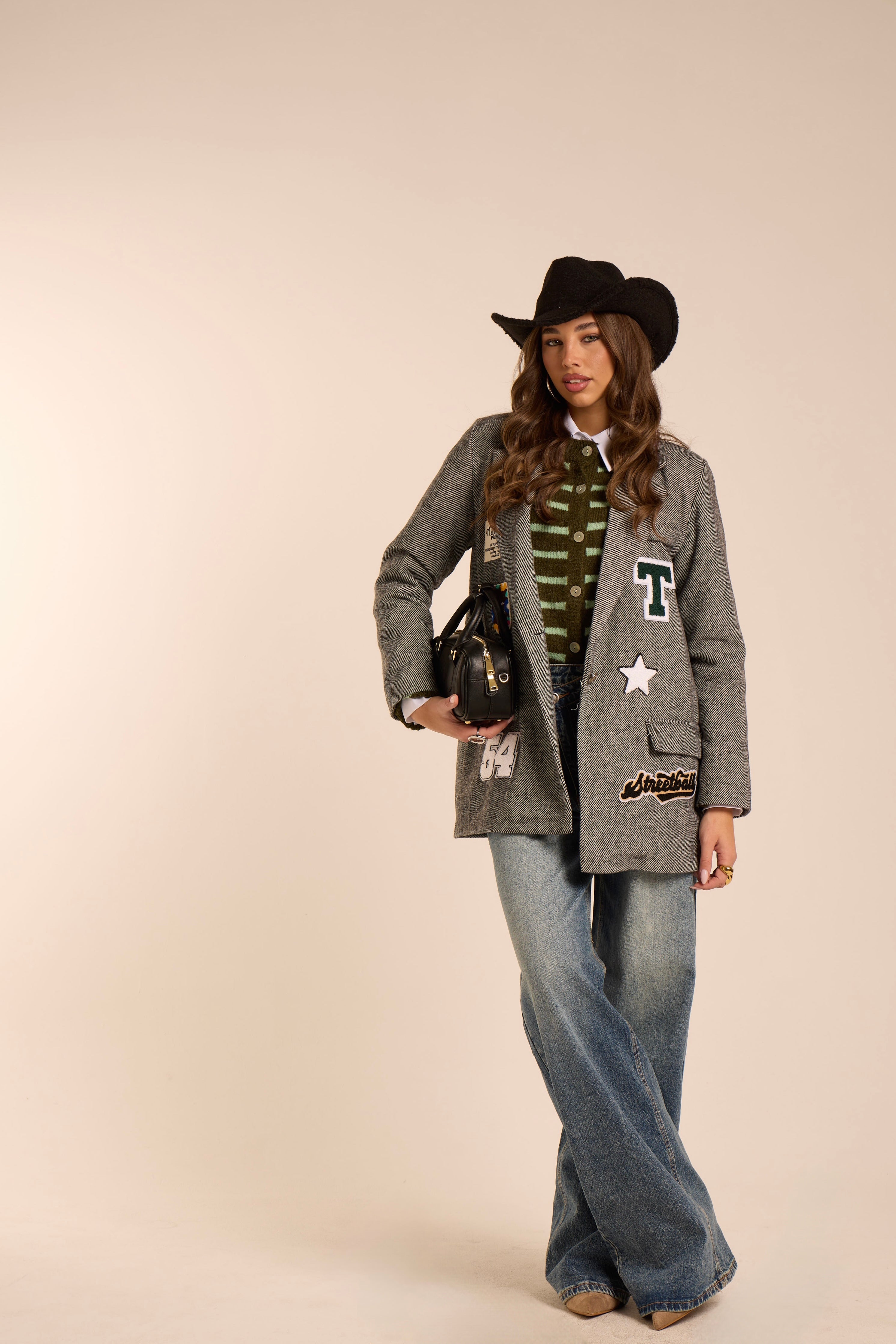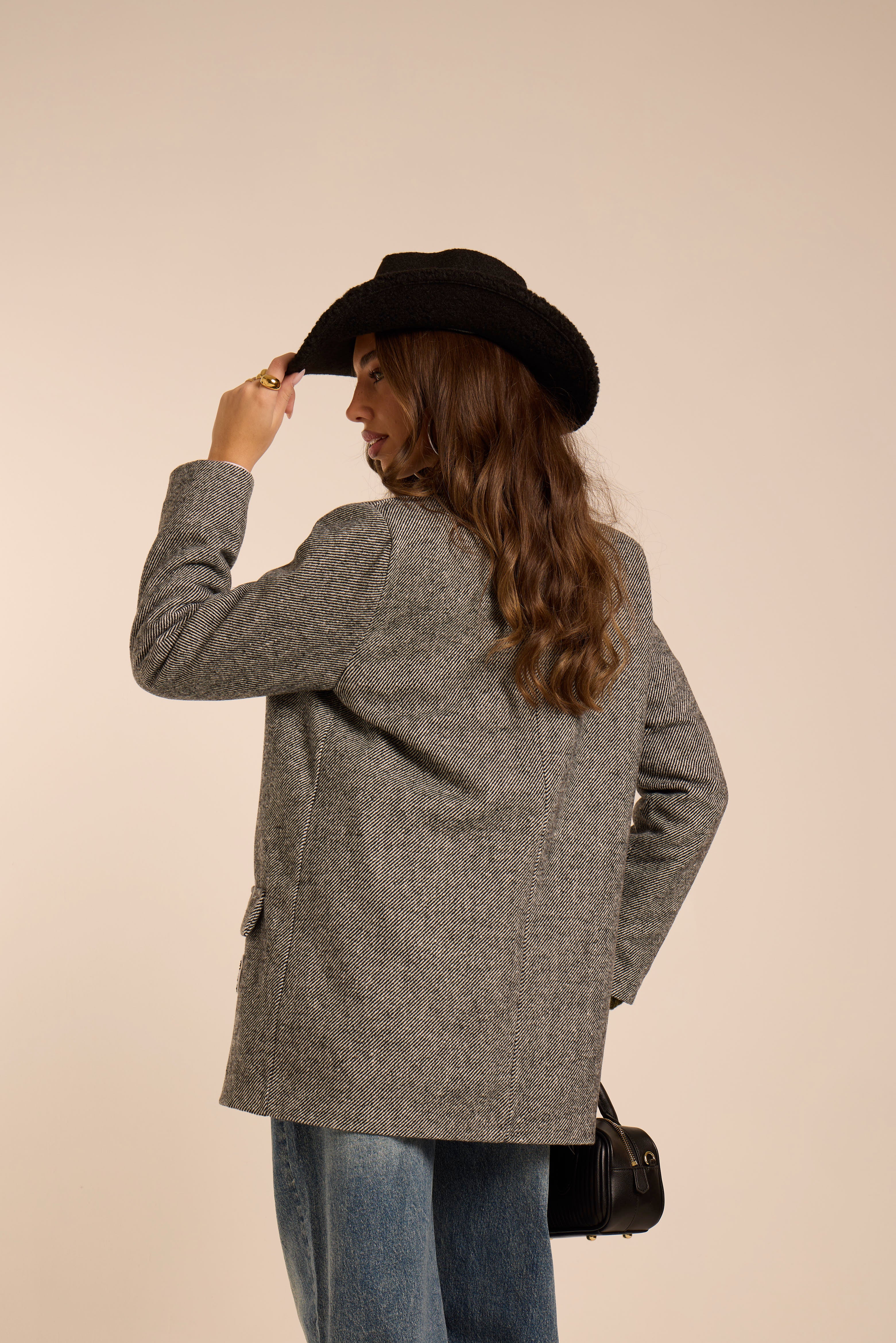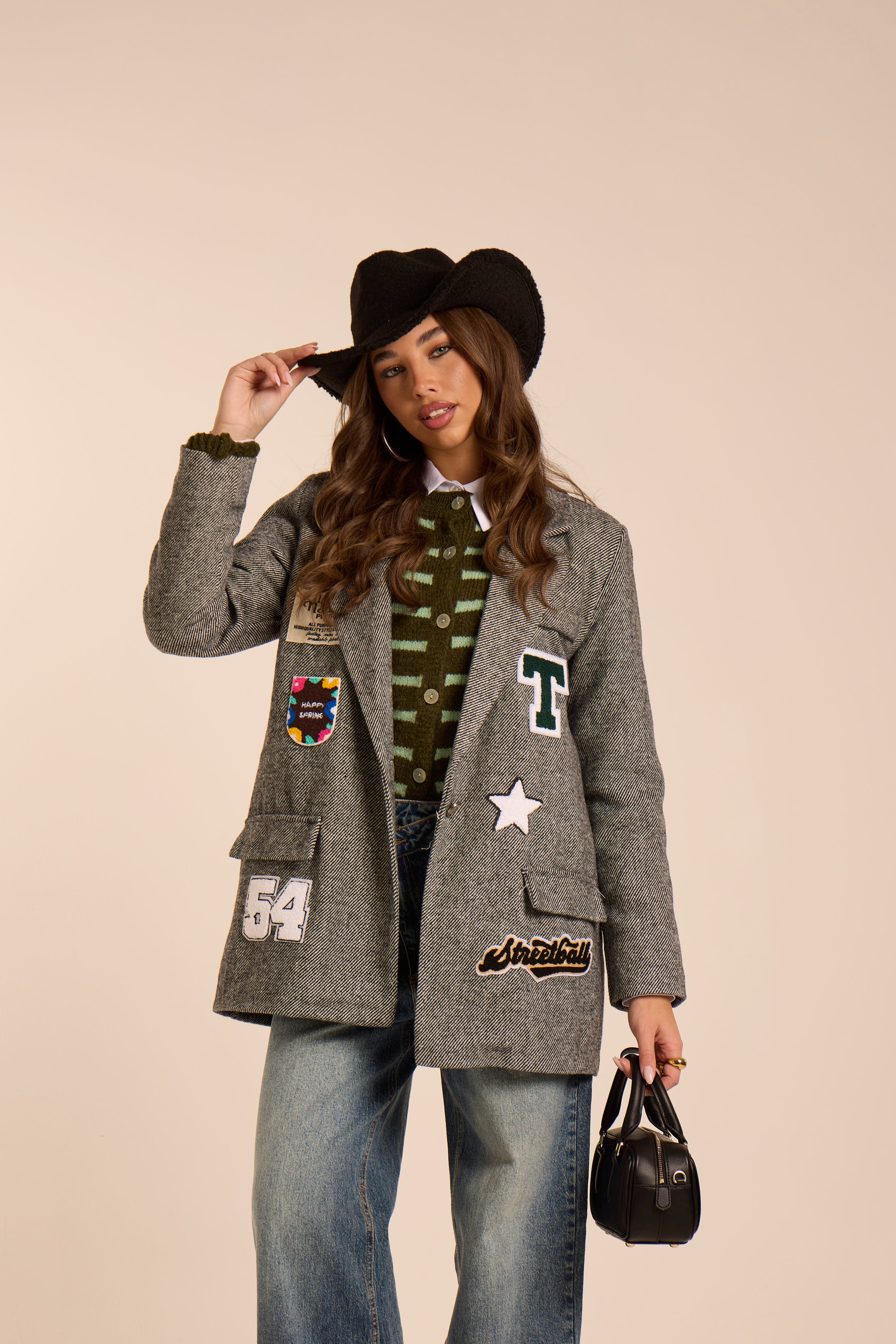 Blazer strutturato con spalla imbottita. In tessuto check pied-de-poule grigio, taglio dritto. Modello Oversize. Dettaglio patch ricamato orsetto applicato sul davanti. Taschino con filetto a contrasto bordeaux. Rever classico, chiusura monopetto con bottone gioiello. Foderato internamente.