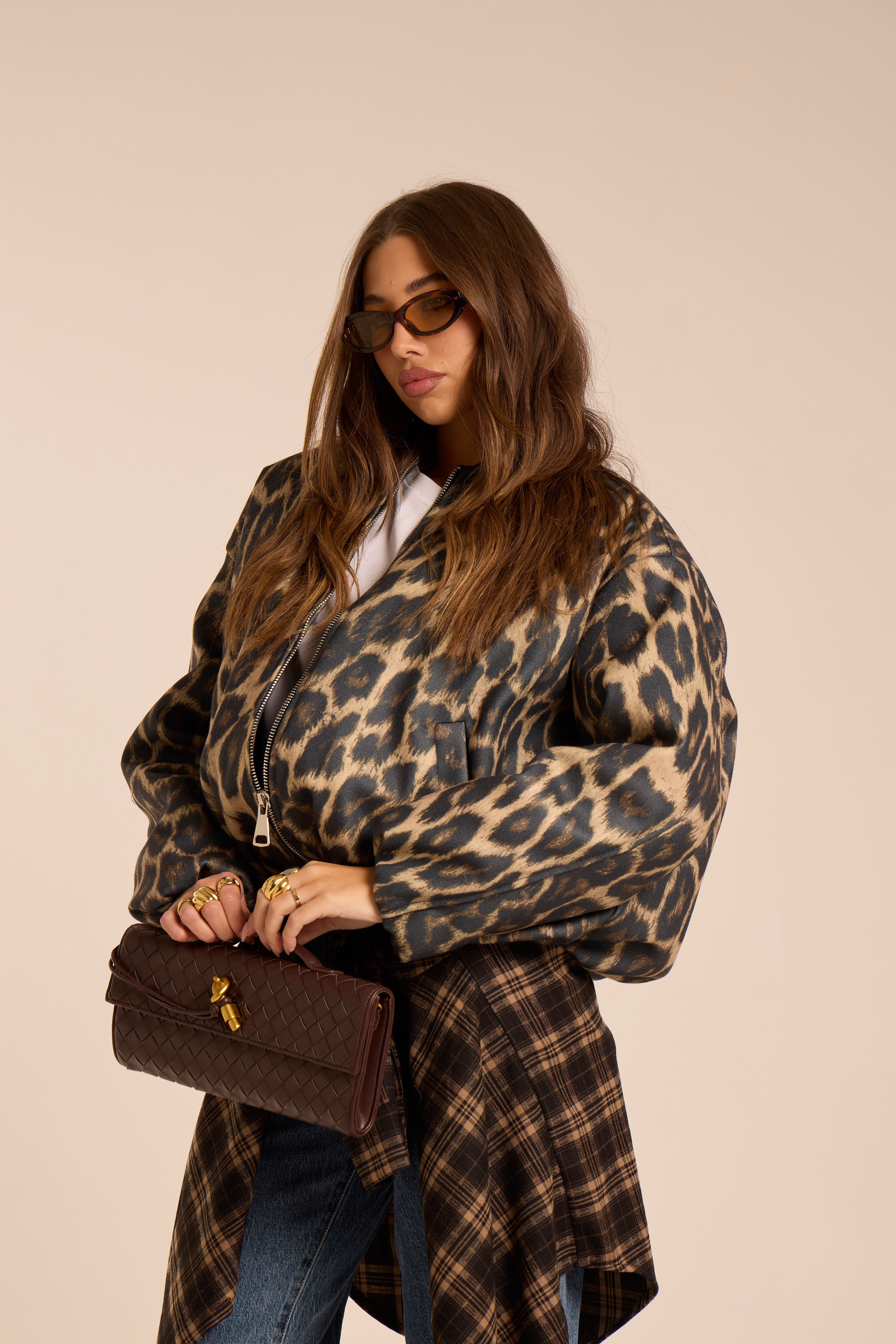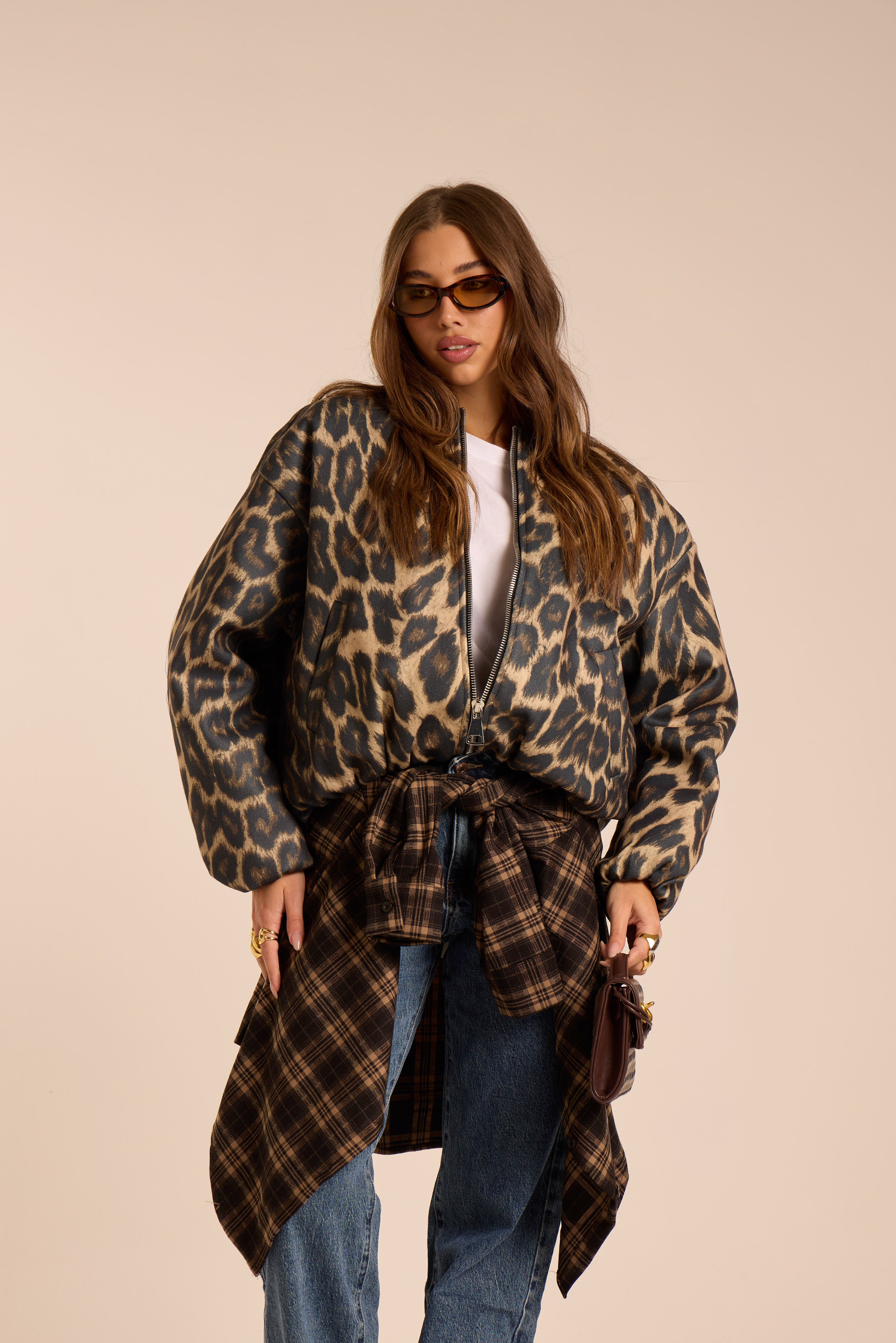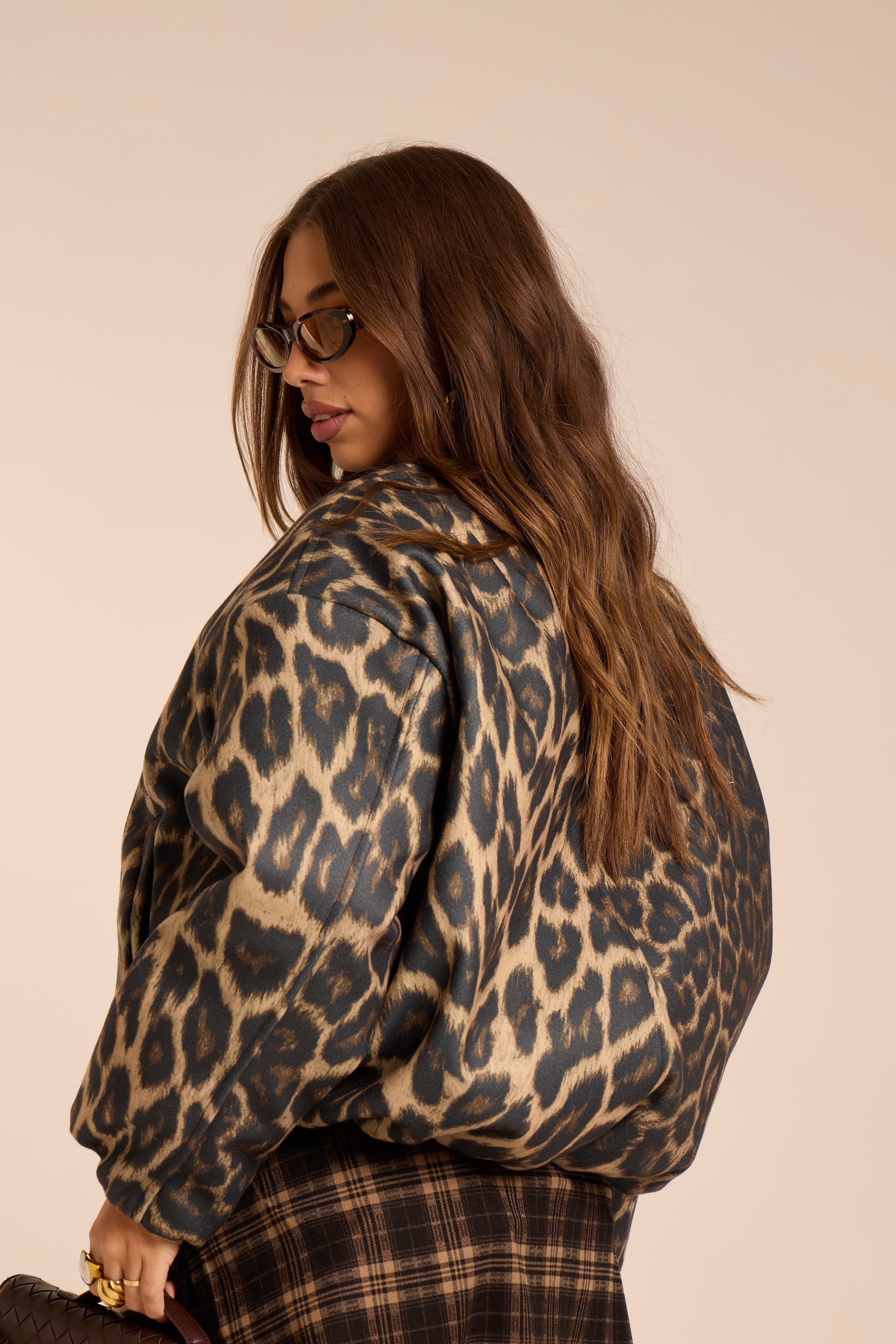 Bomber oversize. Foderato. Trama maculata. Chiusura frontale con cerniera. Tasche laterali. Arrocchiato sul fondo. Manica spalla bassa.