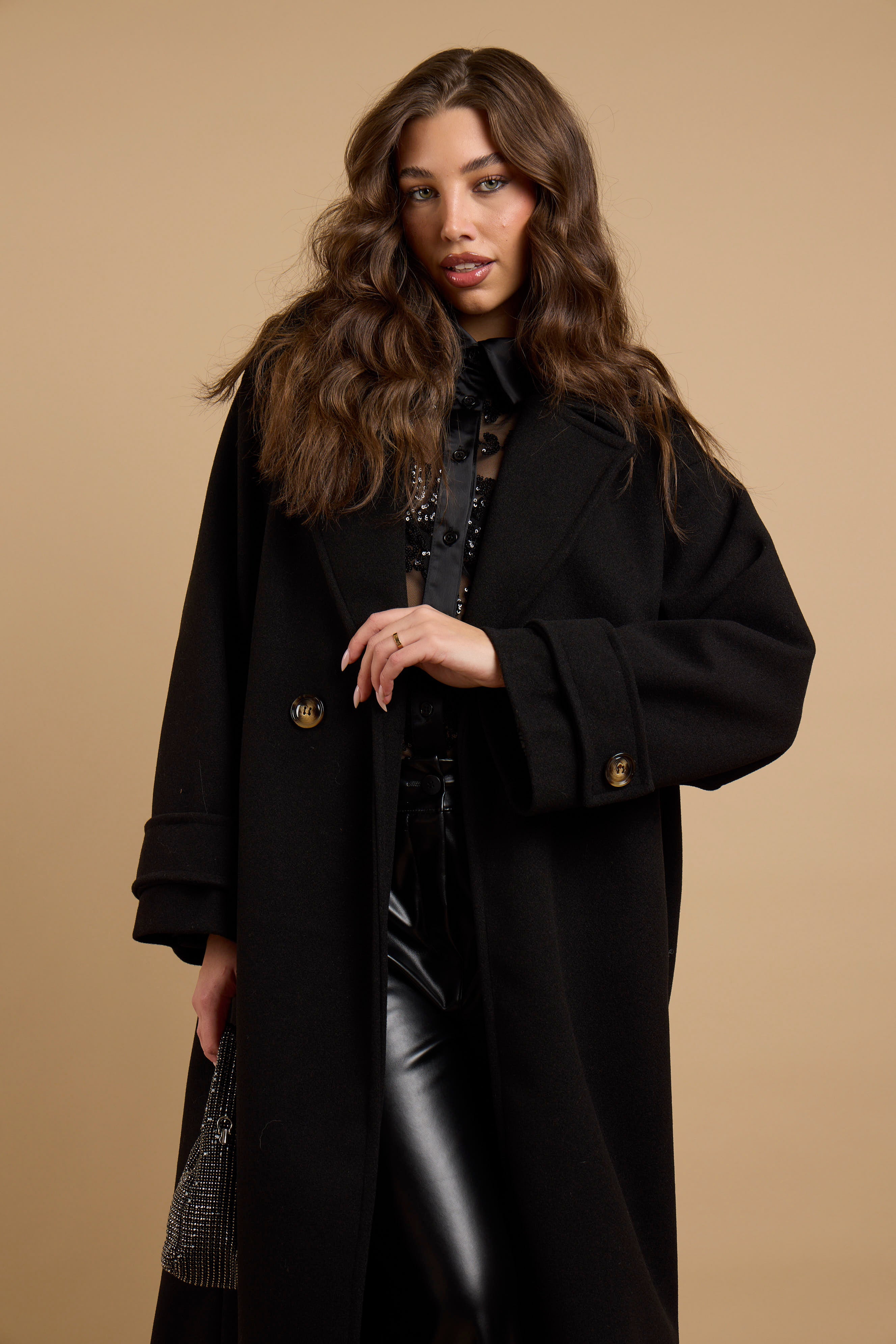 Cappotto lungo in morbido panno, effetto lana. Color tortora chiaro, dalla linea dritta e pulita. Presenta revers ampi, abbottonatura monopetto con bottone tono vintage, maniche con risvolto strutturato e taglio leggermente oversize per effetto elegante e senza tempo. Perfetto per look minimal e sofisticati.