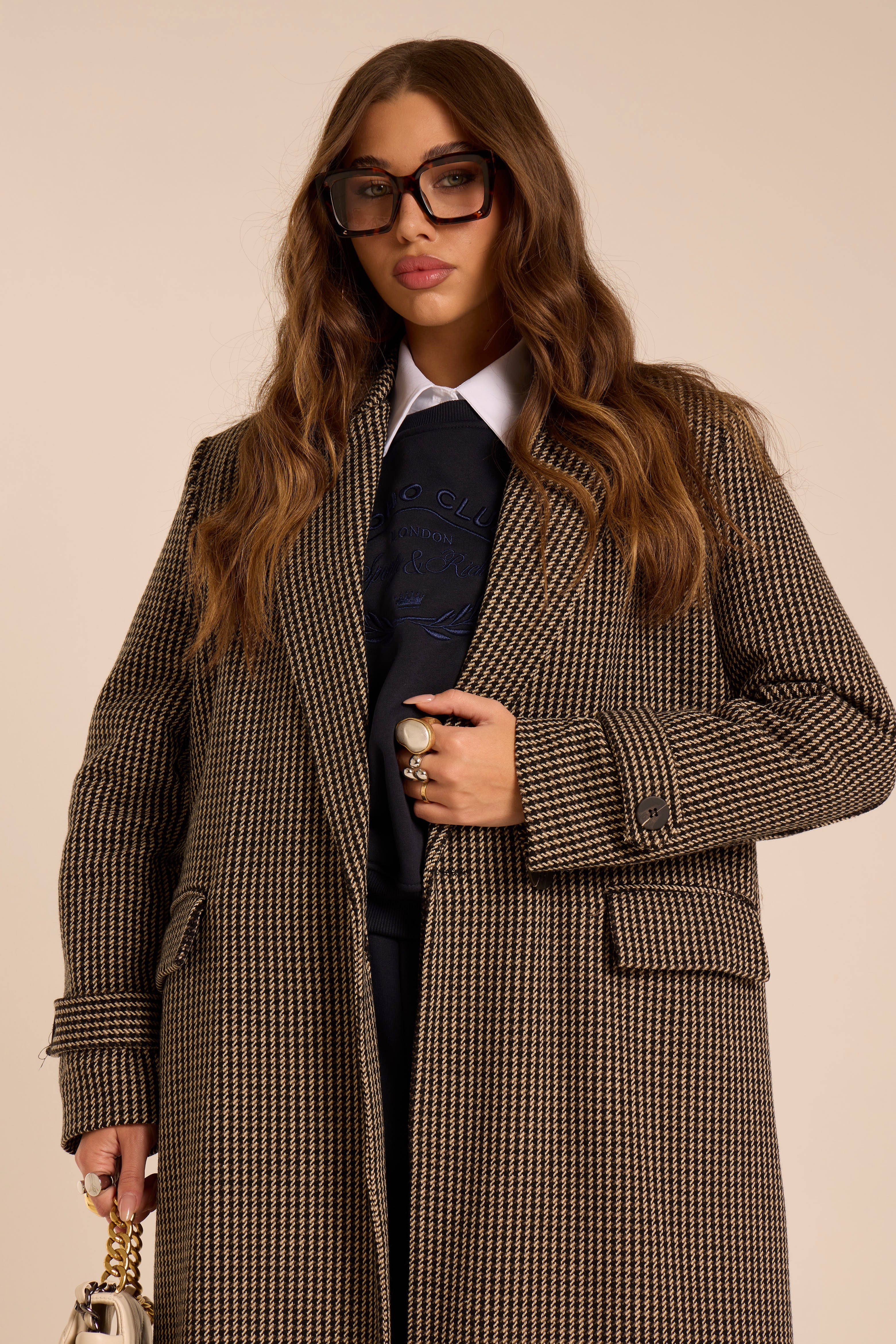 Cappotto lungo. strutturato. Scollo a revers. Tasche frontali a patta. Chiusura frontale con bottone. Foderato. Toni del nero, marrone e beige.