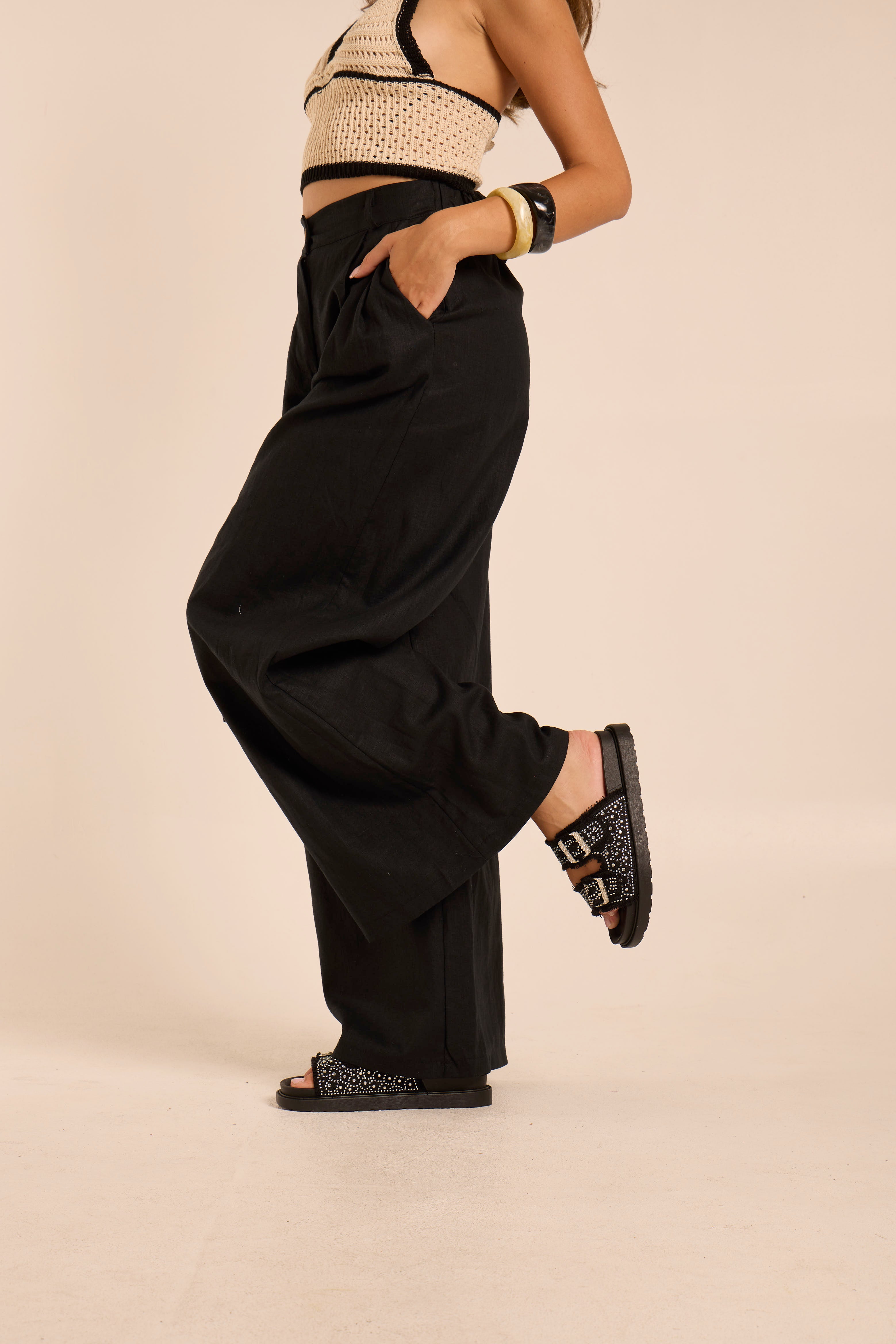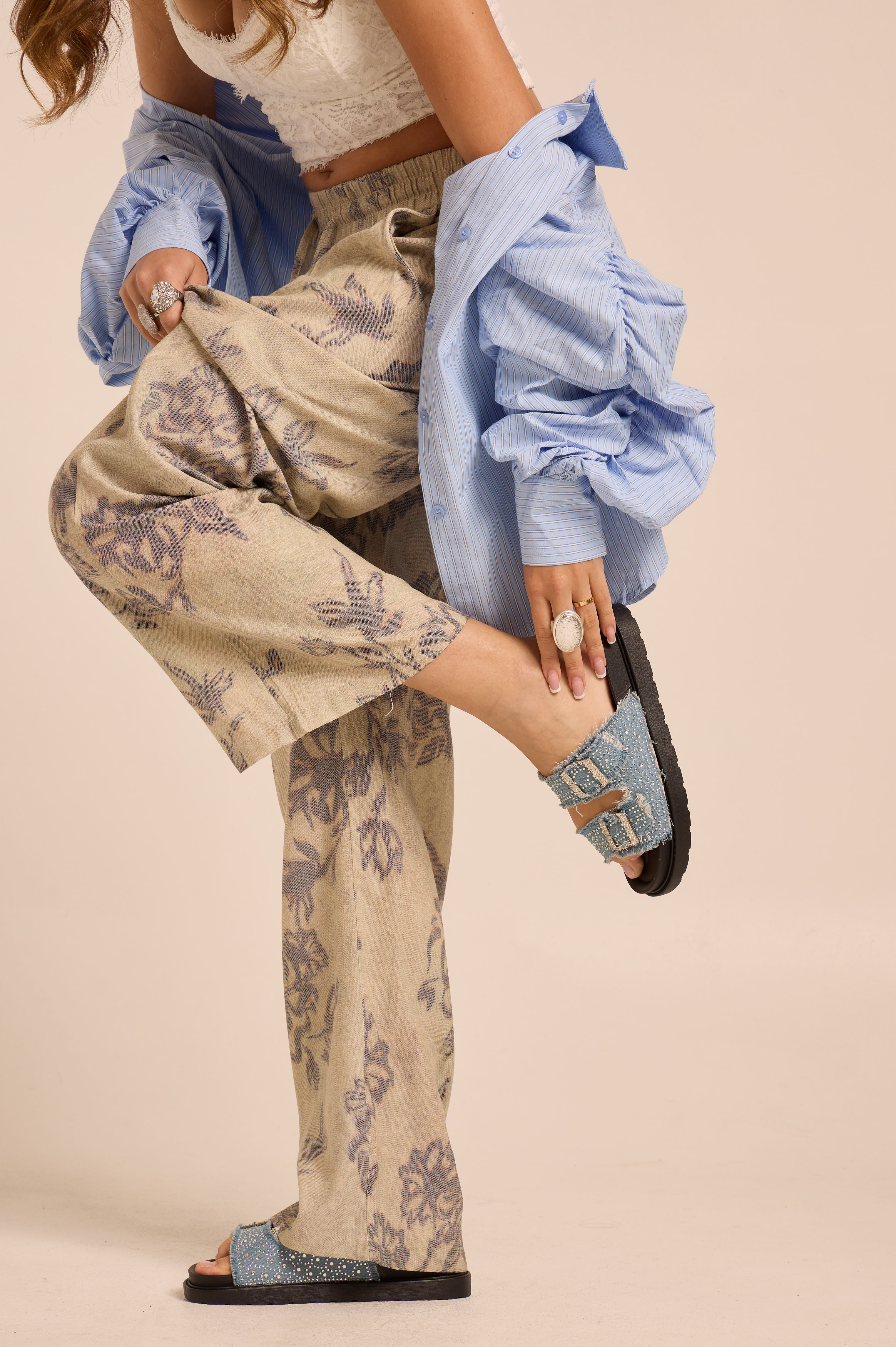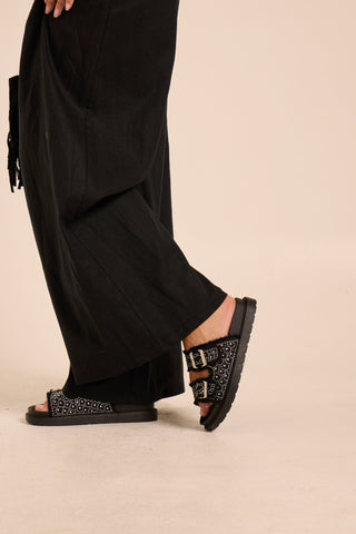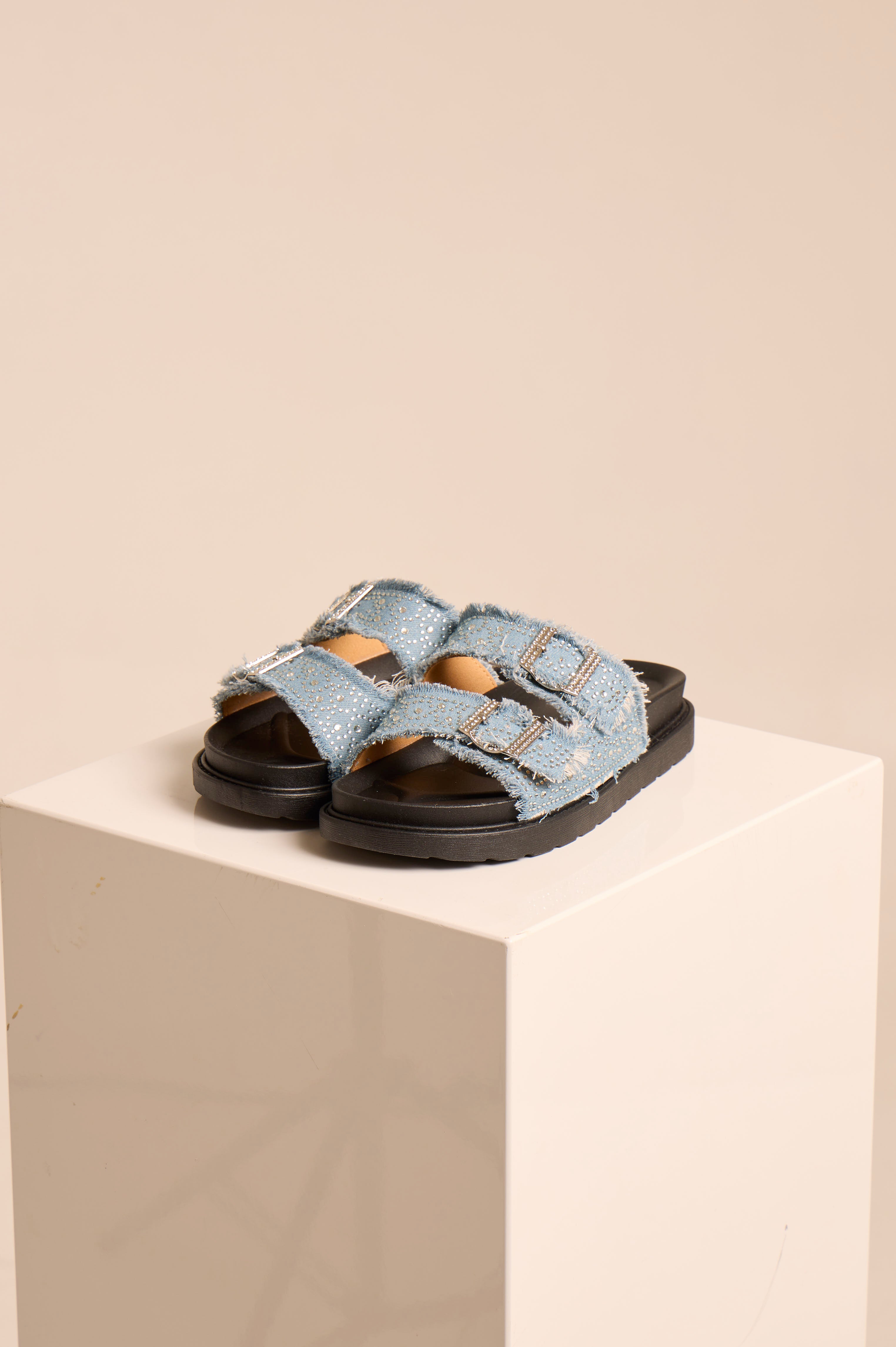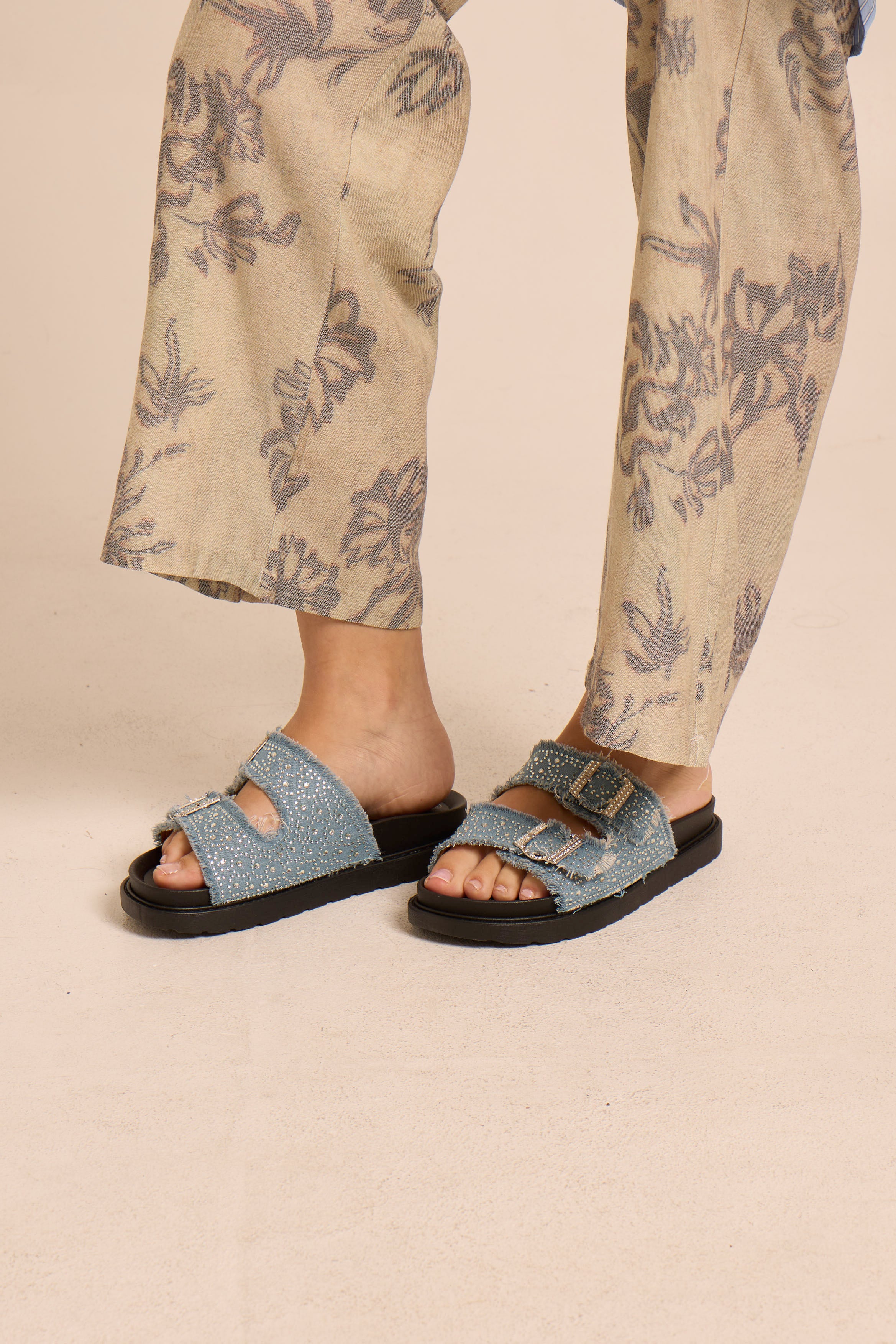 Ciabatta in jeans. Con strass. Regolabile. Pianta in simil pelle.