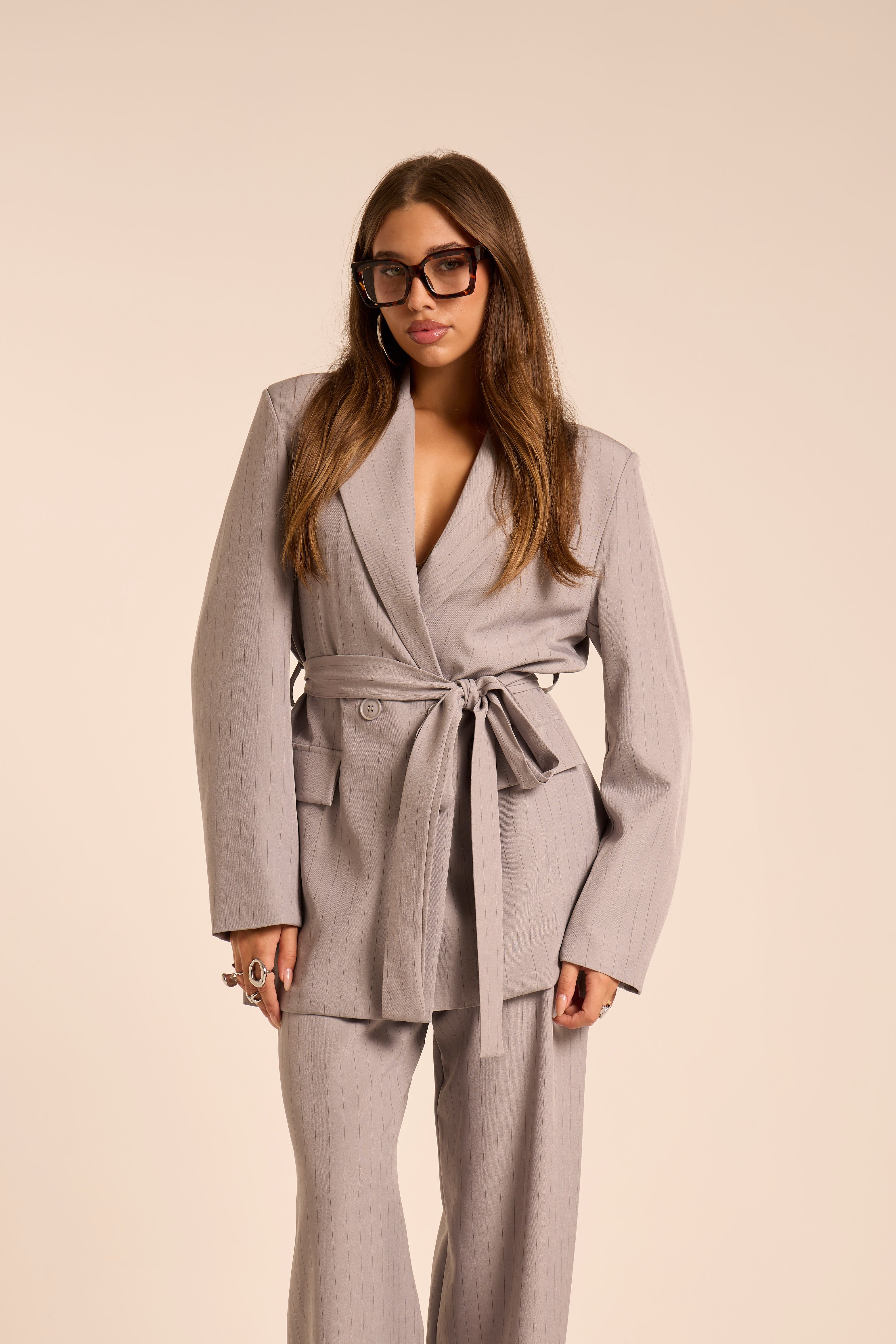 Completo a righe composto da Blazer e Pantalone. Blazer con spalline imbottite, tasche frontali e tasca in linea finta, scollo a revers. Dettaglio chiusura blazer con bottone e passanti per laccio. Pantalone elegante con pence, vita elasticizzata e passanti per cintura. Chiusura con cerniera e bottone.