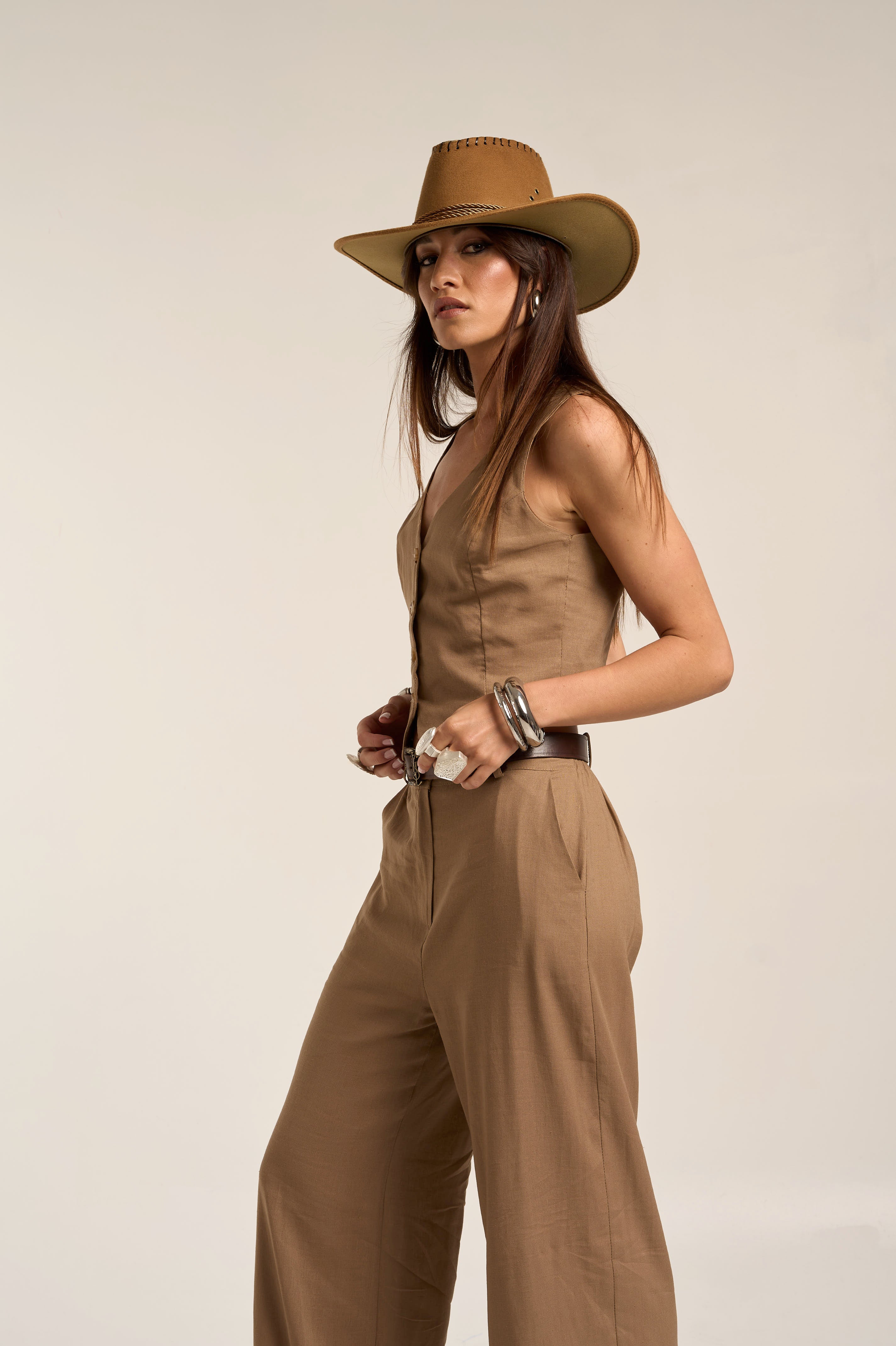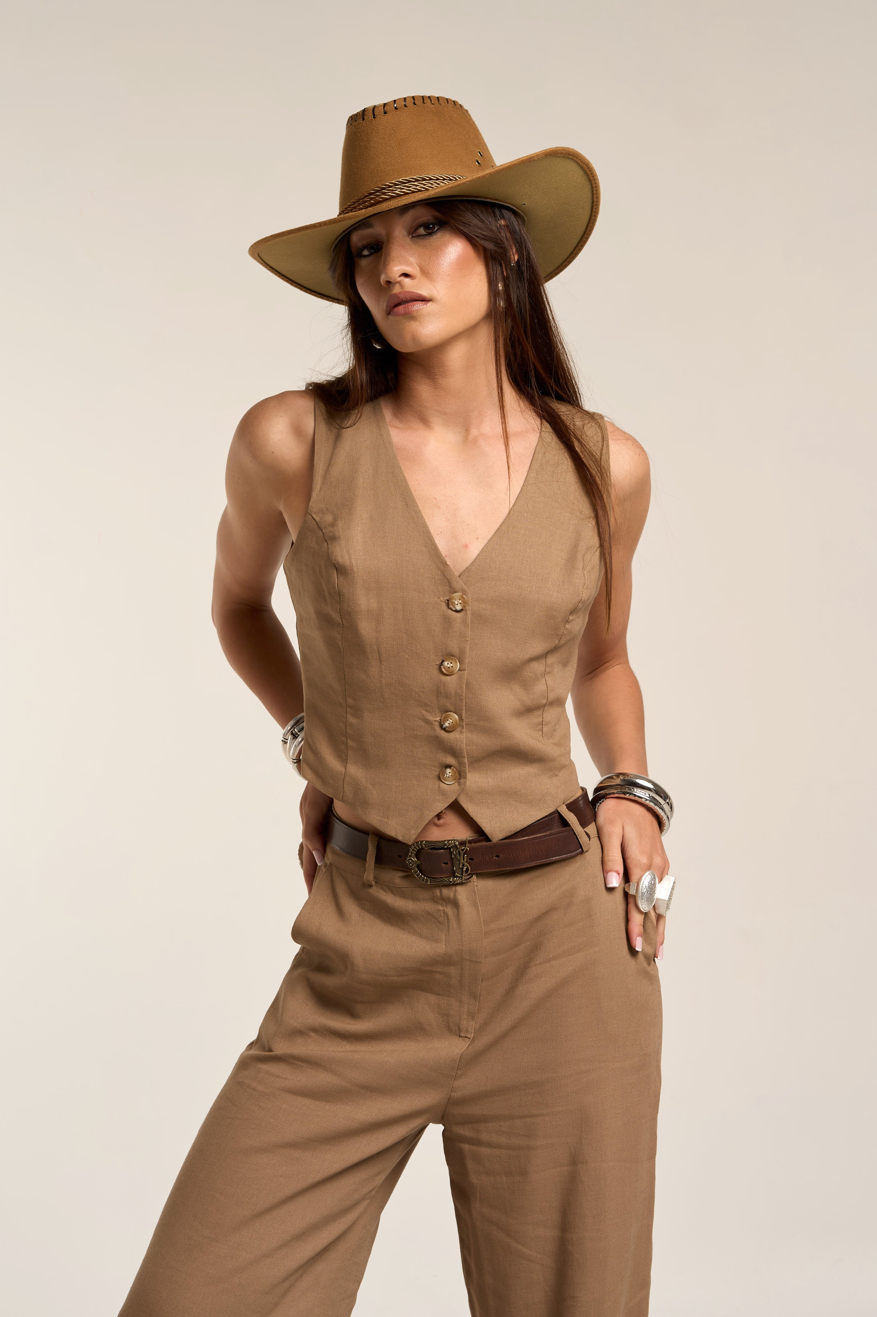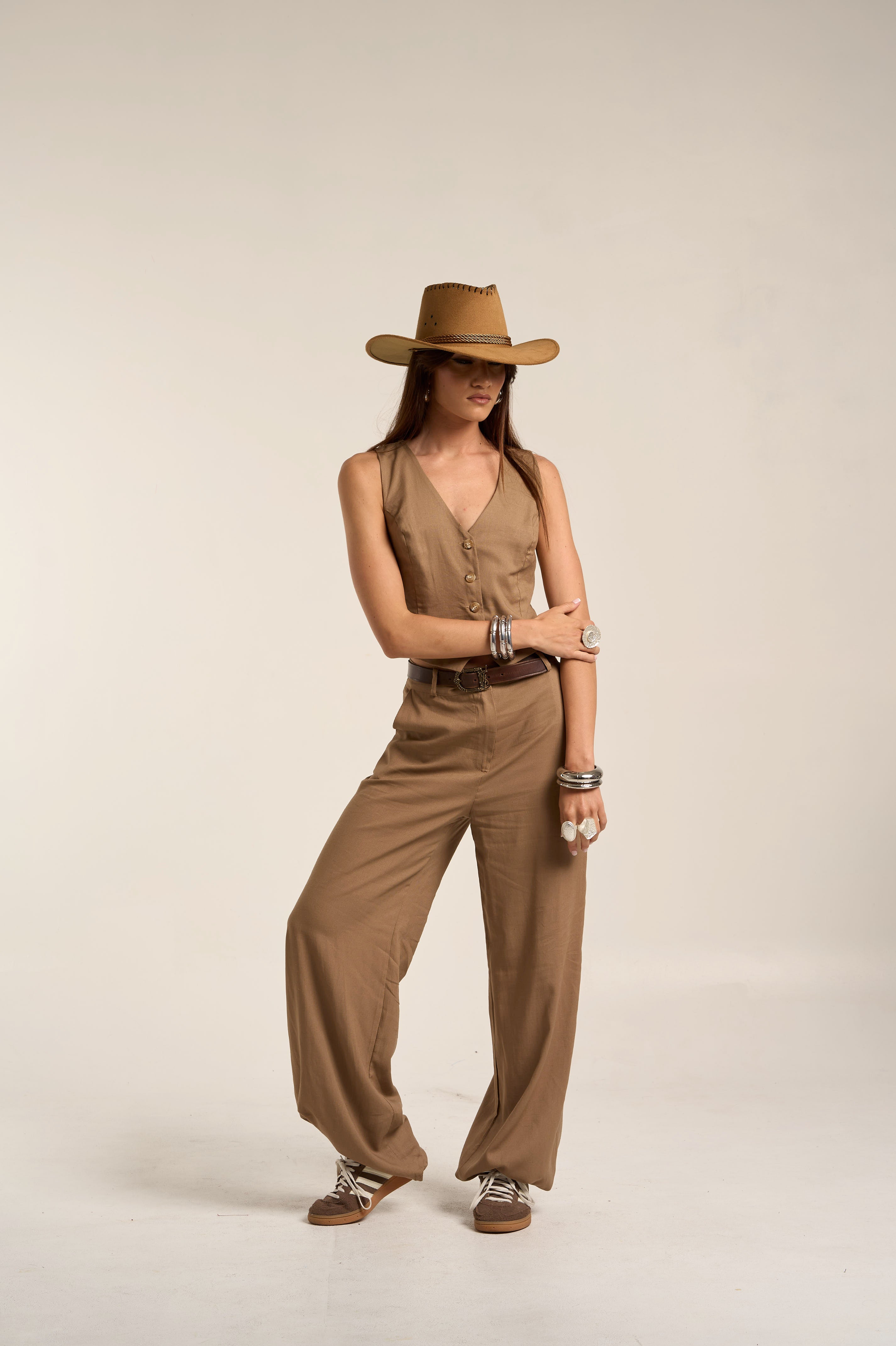 Completo in lino. Composto da gilet e pantalone. Gilet classico. Chiusura con bottoni. Cuciture e finiture tono su tono. Pantalone con vita elasticizzata. A gamba dritta, morbida. Passanti in vita per cintura.