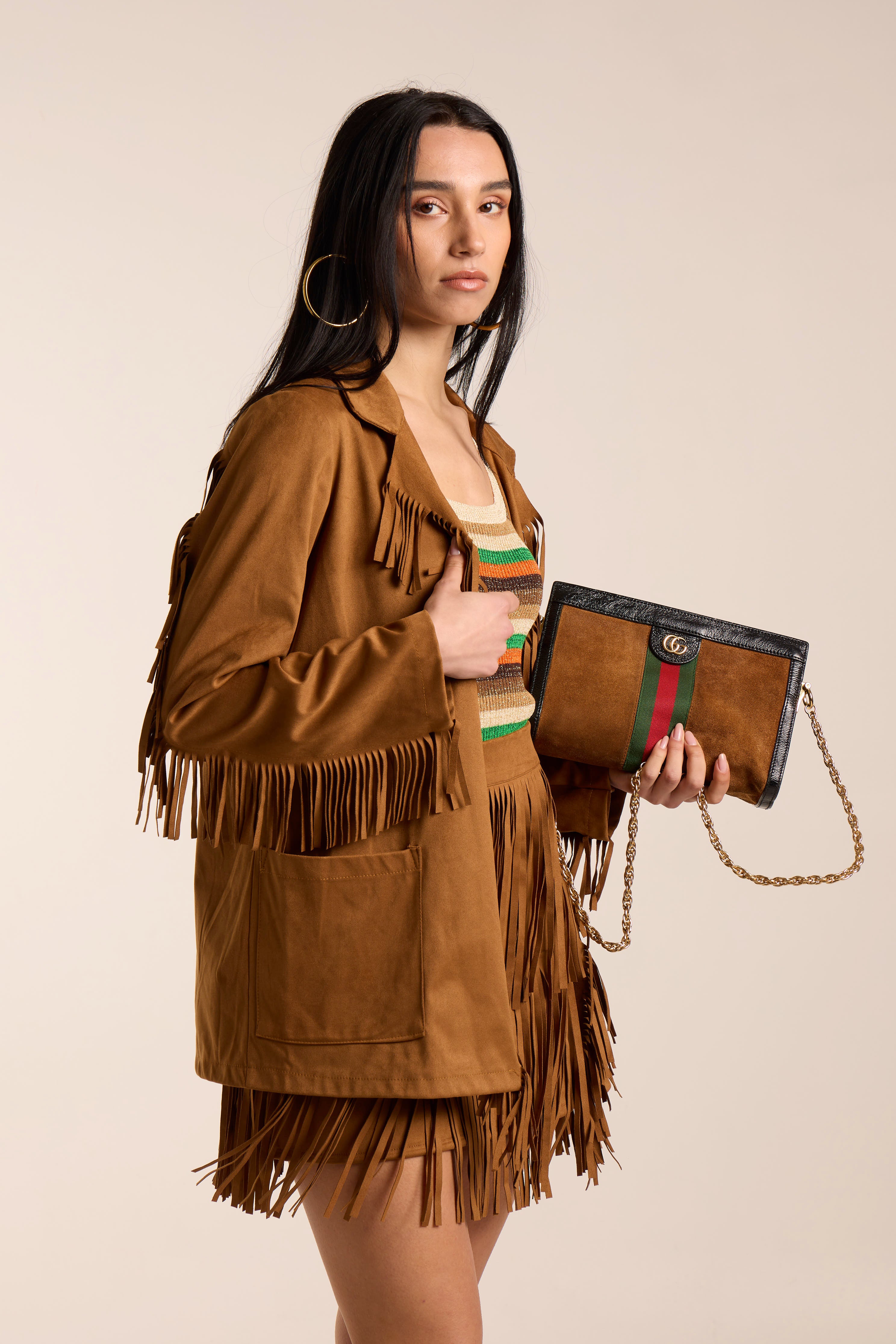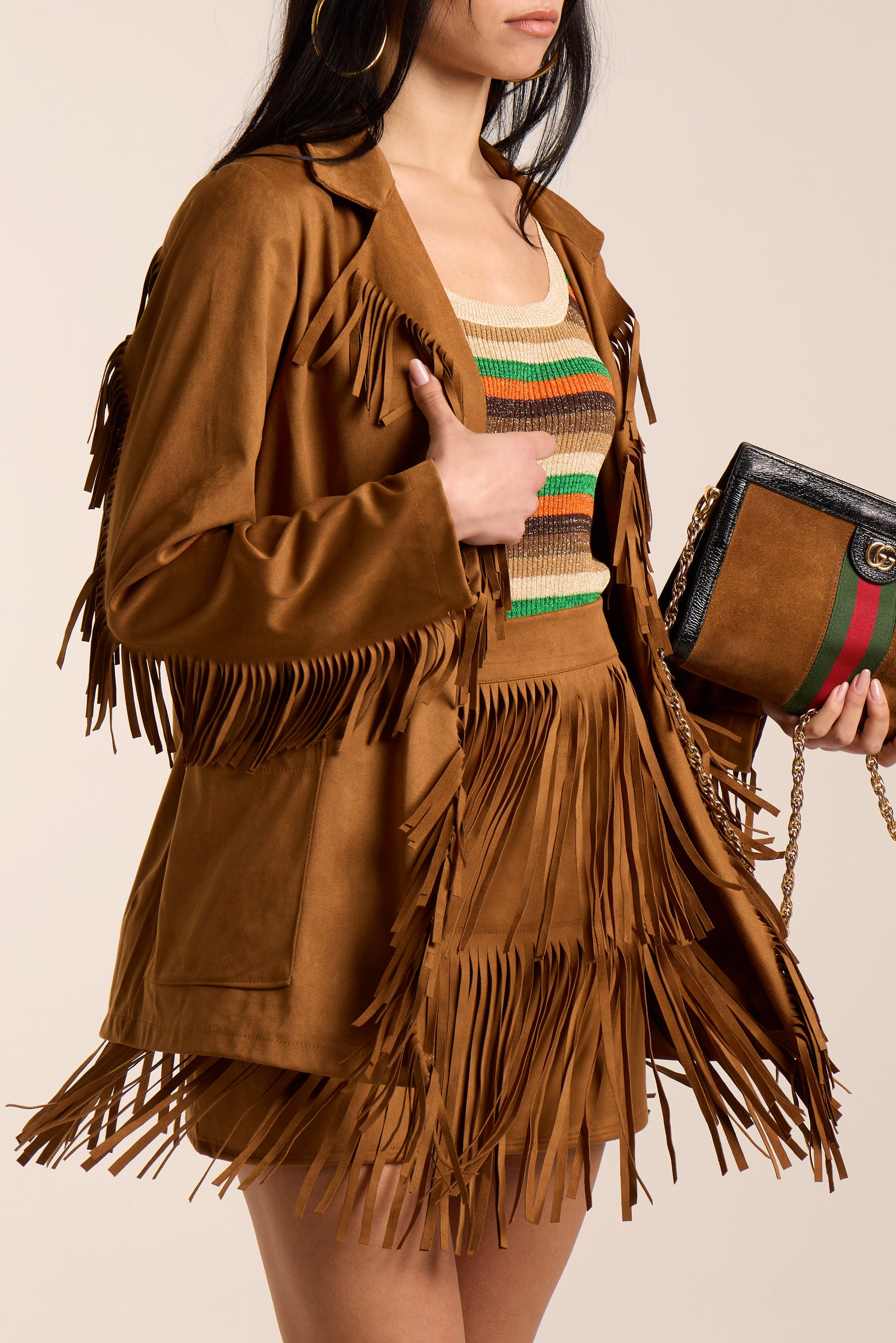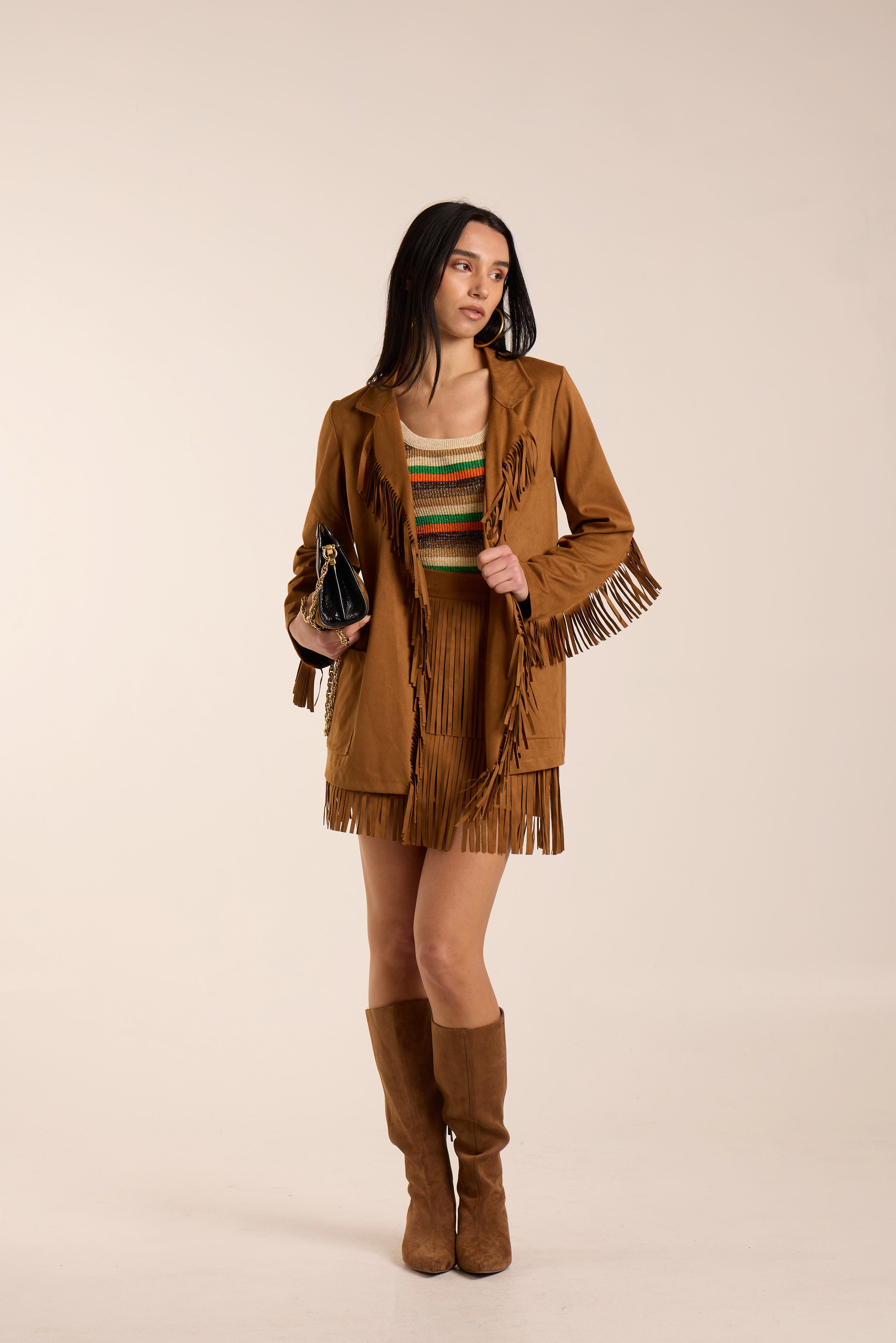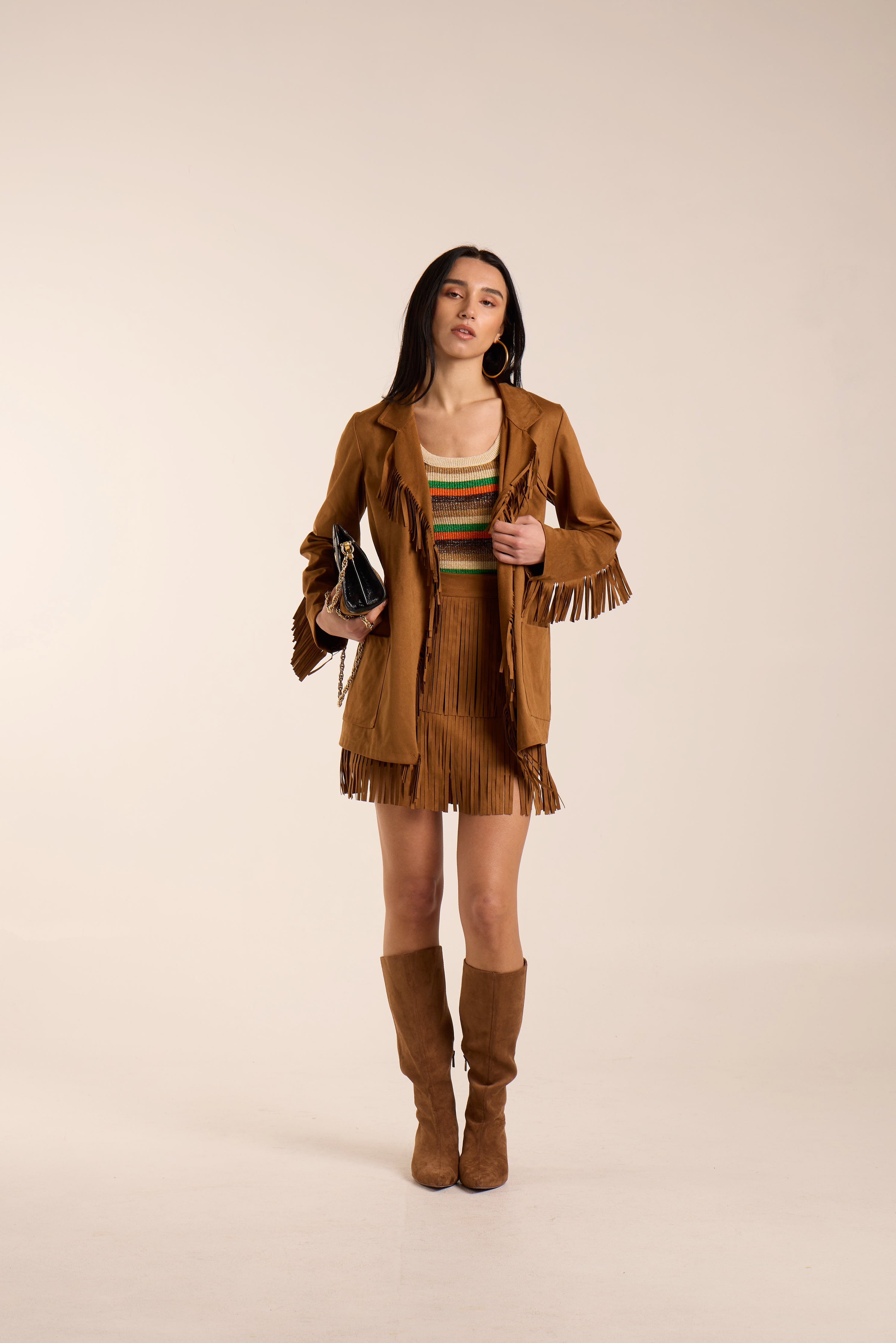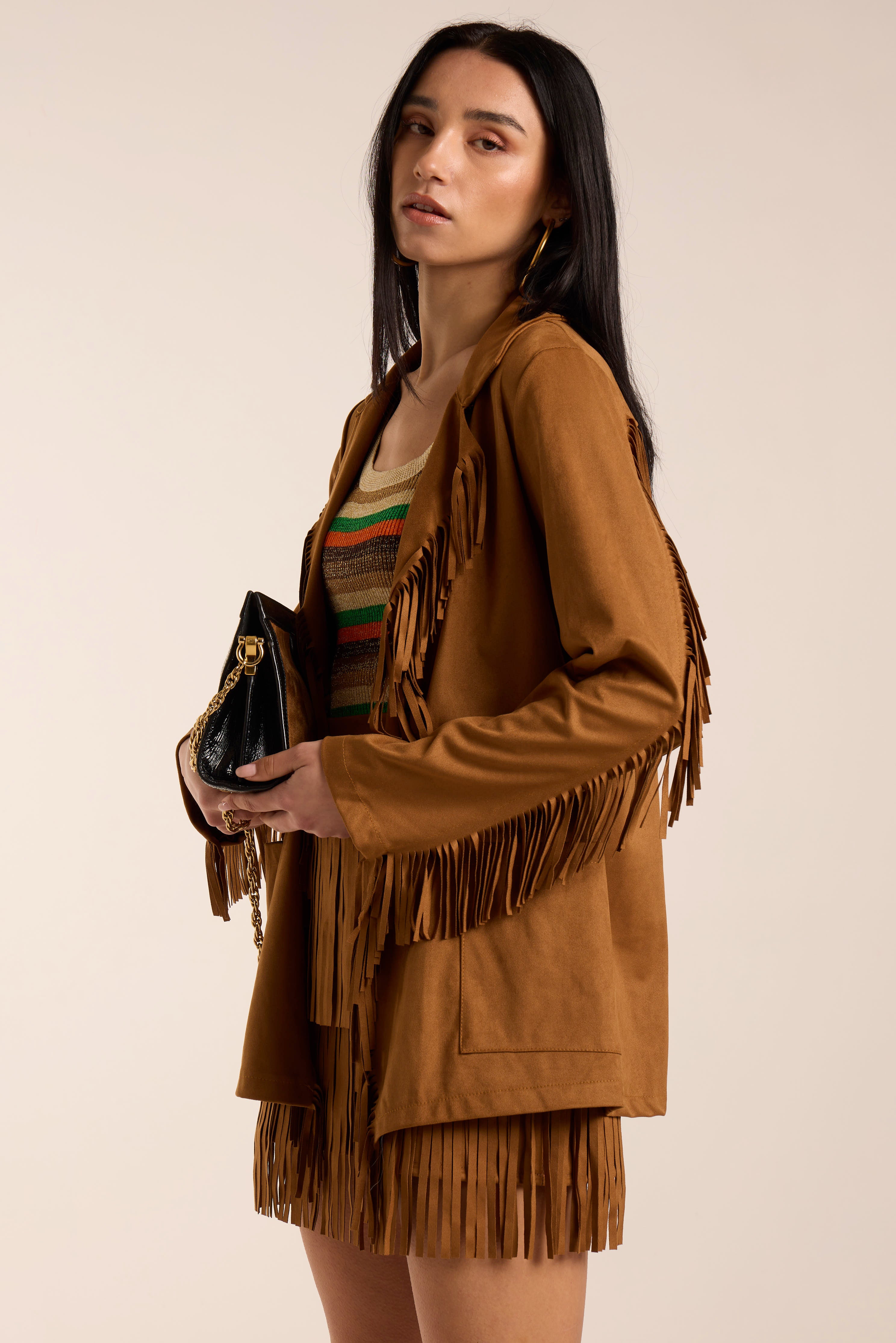 Giacca con frange. Tessuto simil camoscio leggero.Giacca aperta. Scollo a reverse. Tasche frontali centrali.