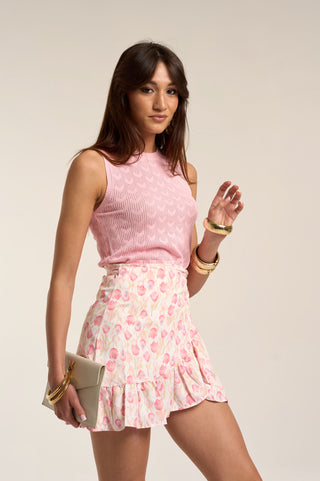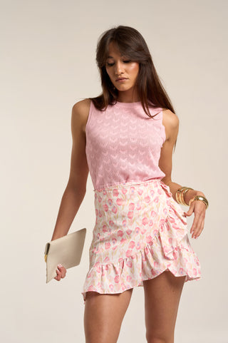 Gonna foderata con chiusura ad incrocio. Fit morbido e svasato. Trama con tulipano, colore predominante sfumatura di rosa.