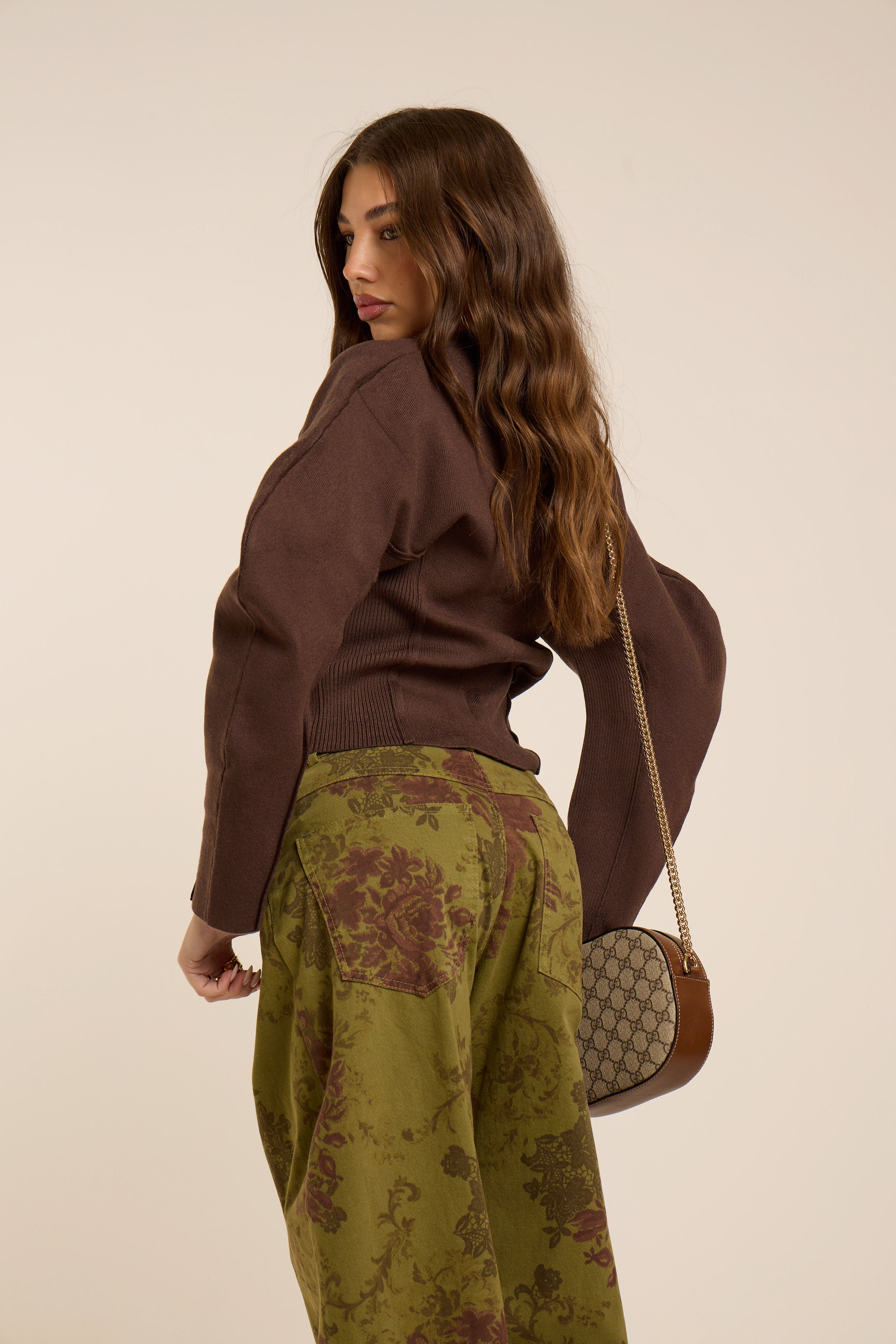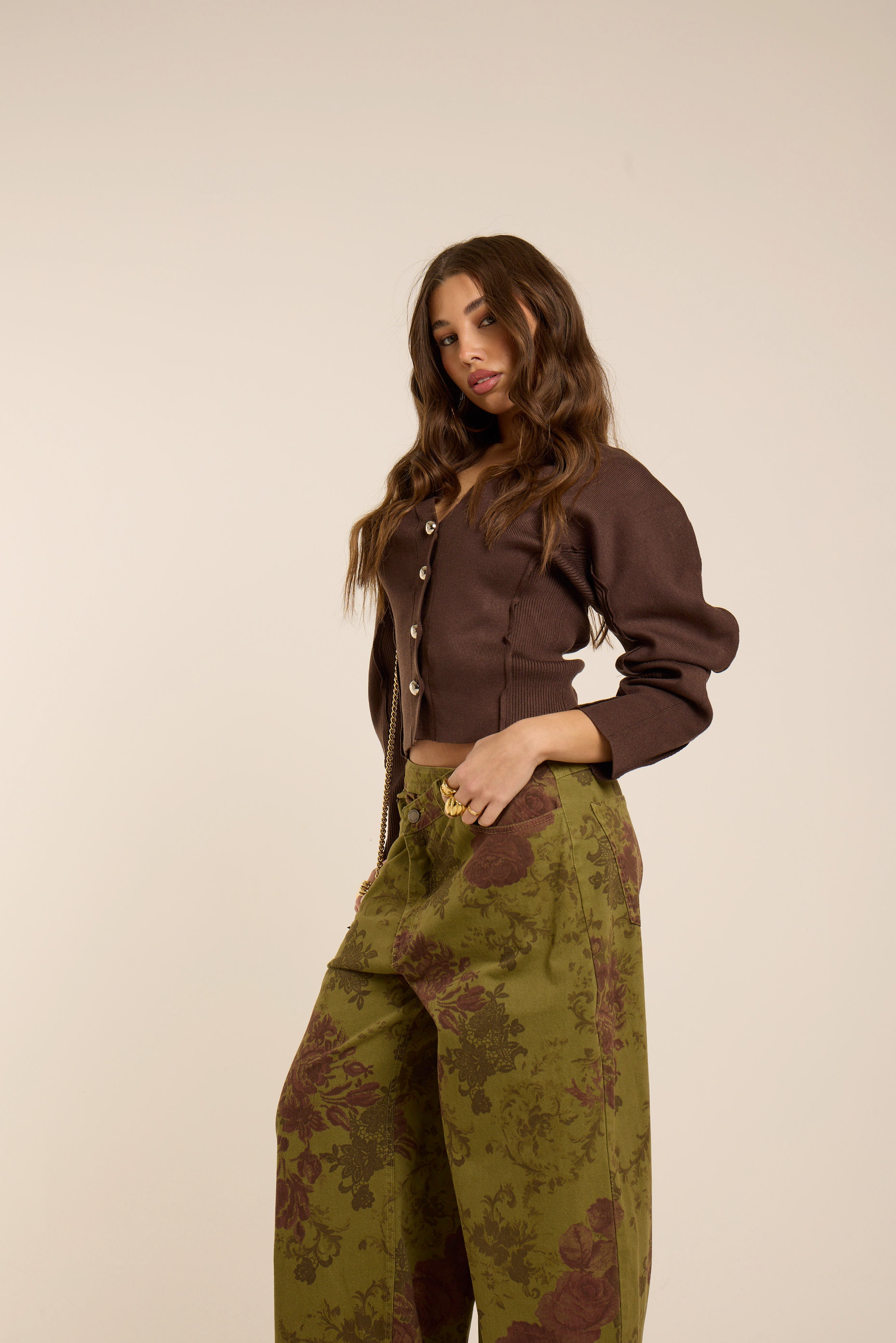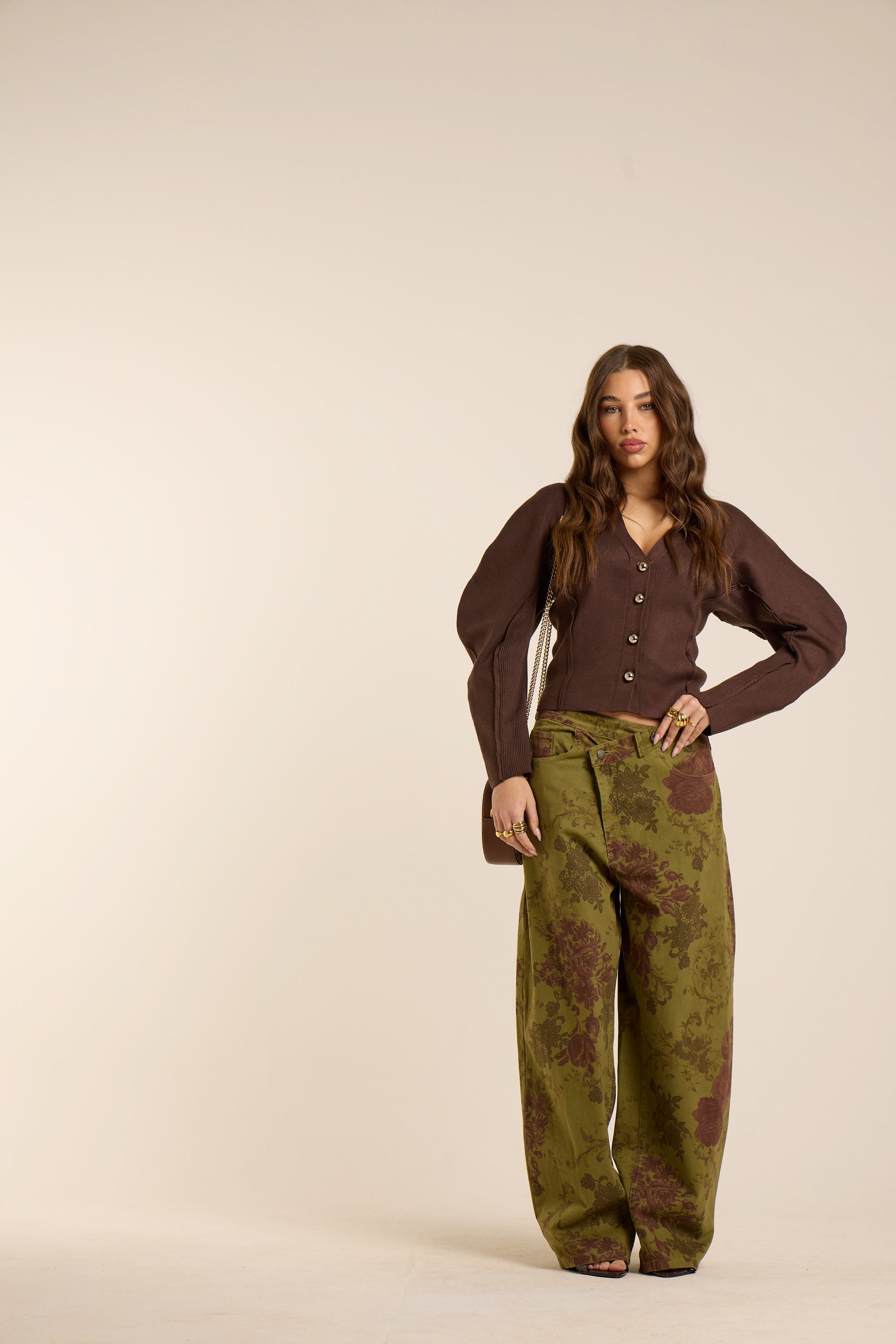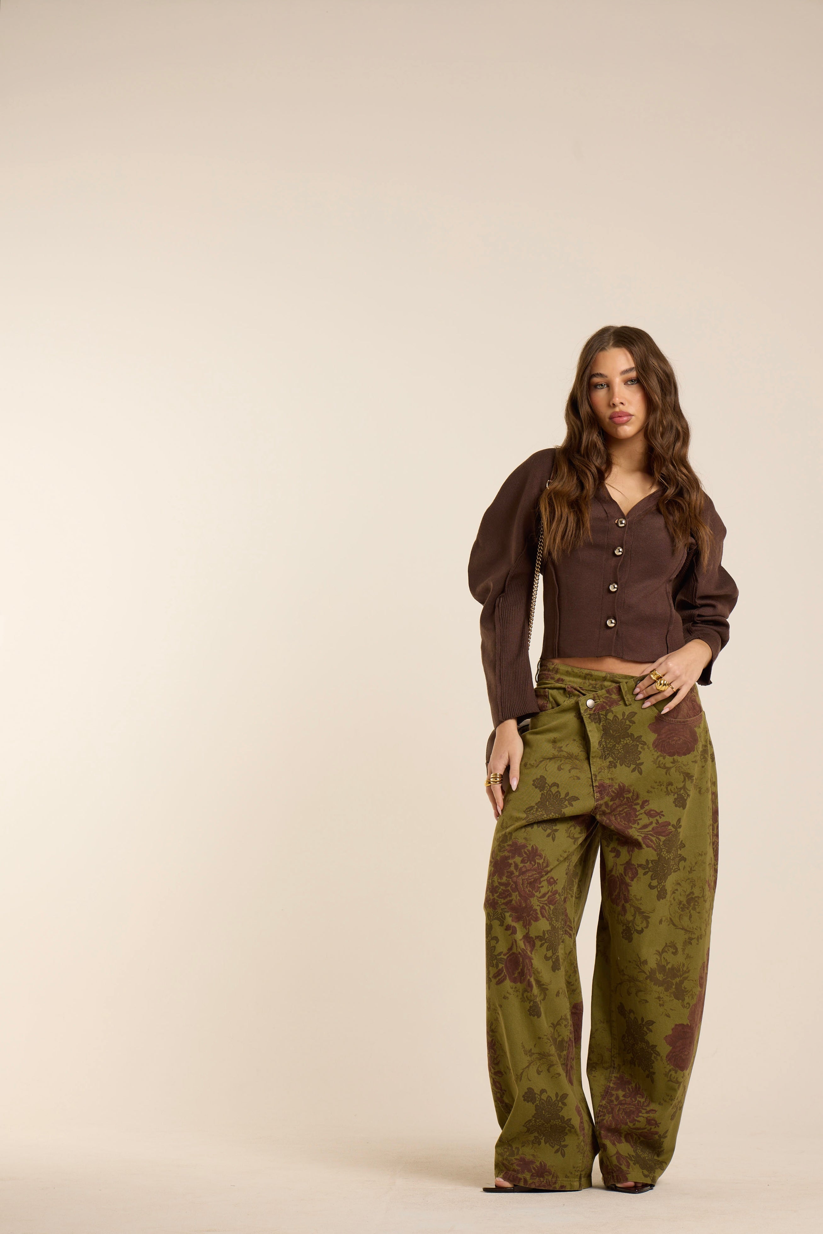 Jeans a vita alta con gamba dritta, ampia e balloon costruzione fluida e caduta morbida. Denim stampato con motivo floreale barocco nei toni del verde oliva e borgogna profondo, per un effetto tappezzeria couture. Vestibilità relaxed. Dettaglio vita intrecciata.