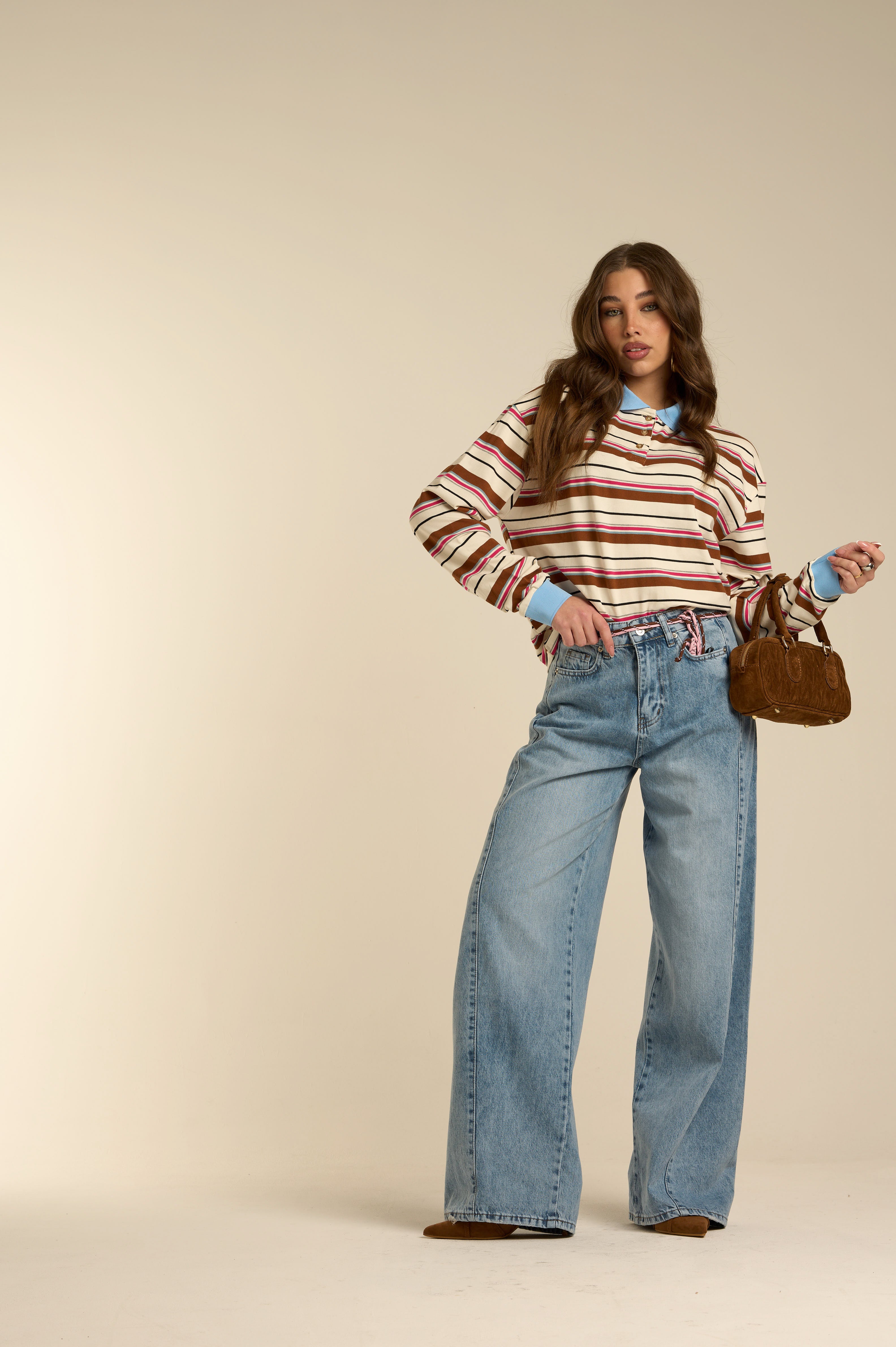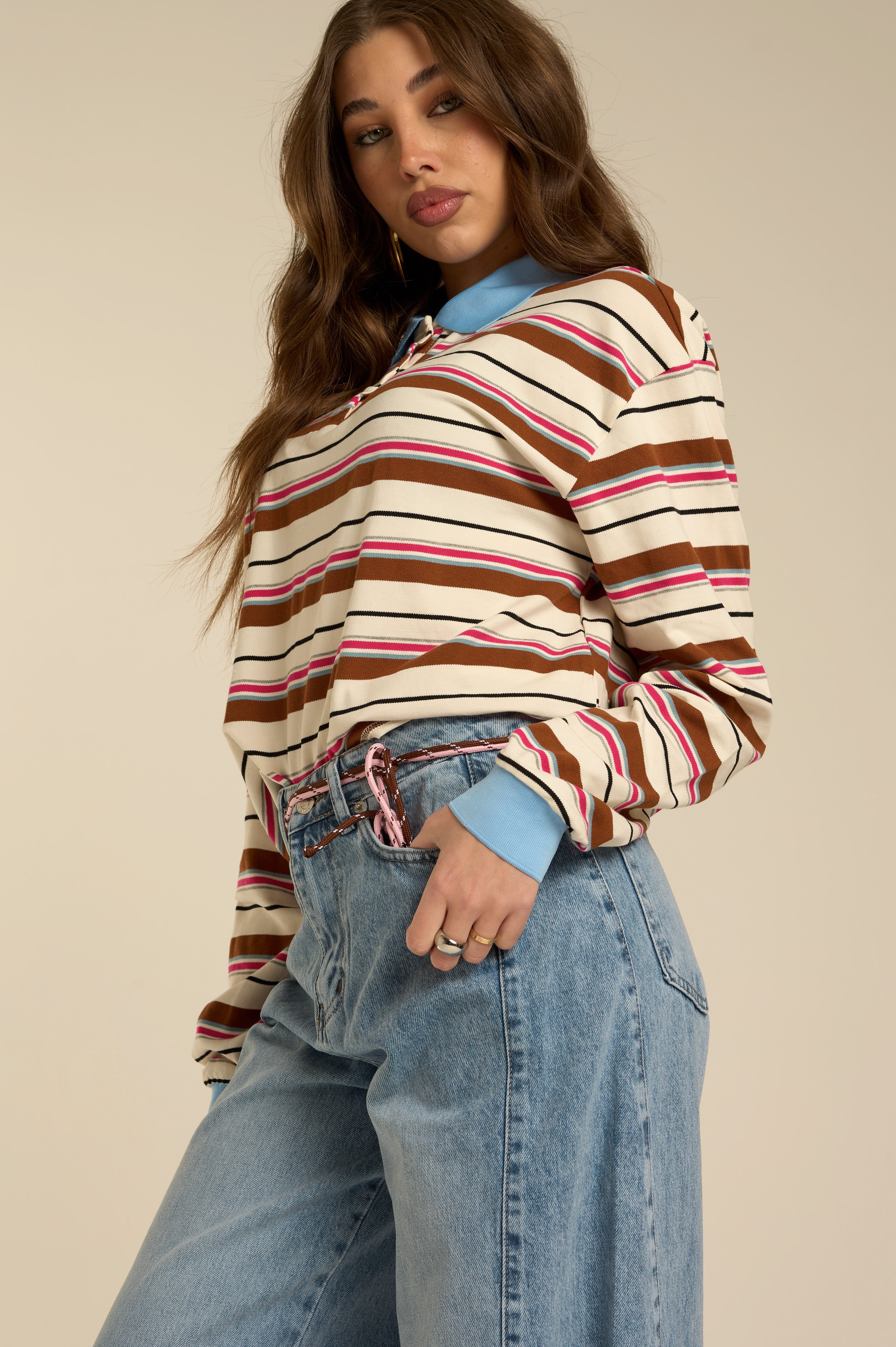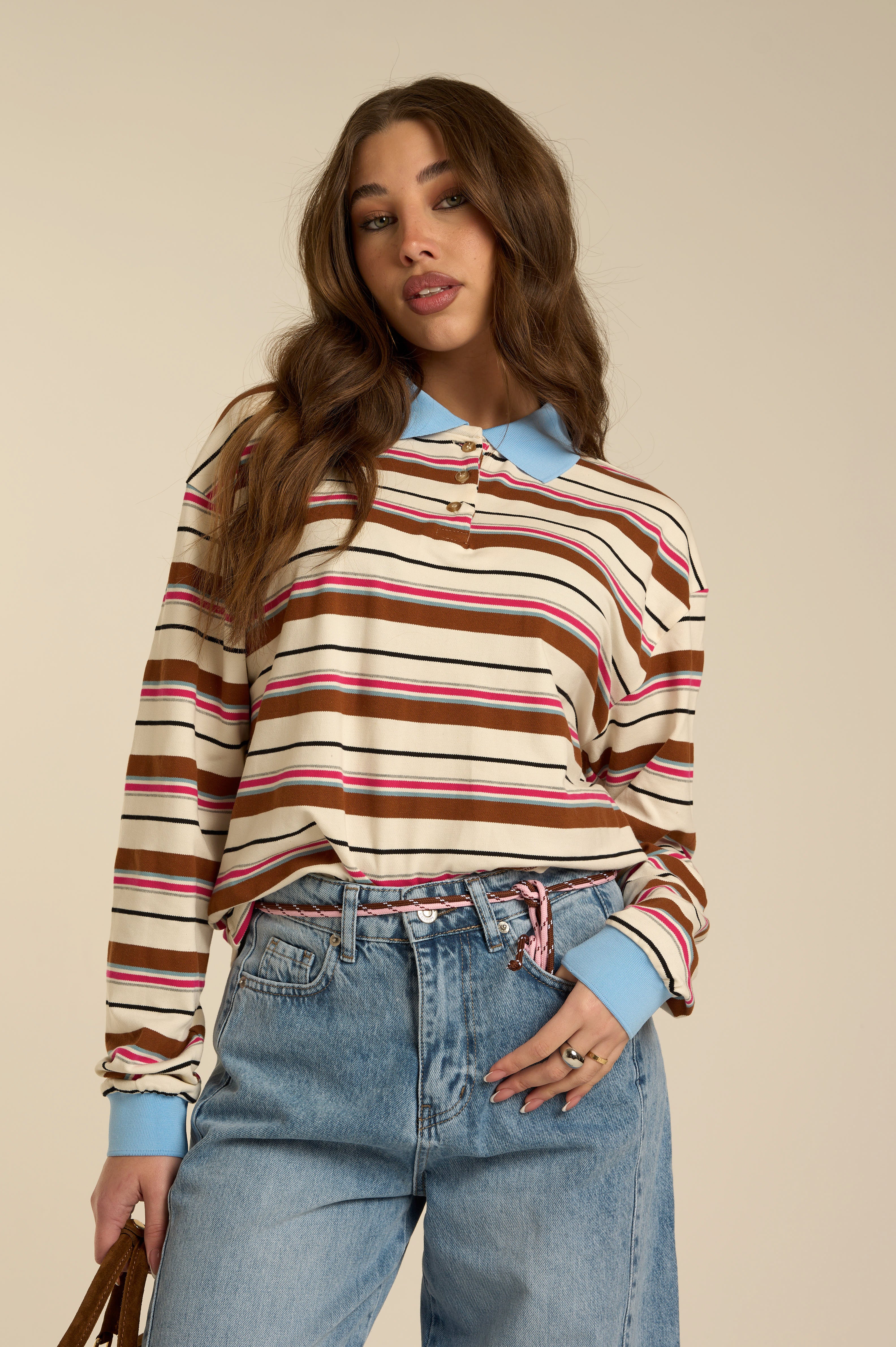 Maglia a manica lunga in tessuto morbido e compatto, con motivo a righe orizzontali multicolor su base panna. Le righe alternano tonalità calde di marrone e beige con accenti rosa e azzurro, creando un equilibrio grafico raffinato. Colletto polo in azzurro a contrasto con chiusura a tre bottoni, polsini coordinati nello stesso colore. Vestibilità leggermente rilassata, linea pulita e gusto rétro contemporaneo.