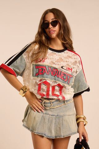 T-shirt modello oversize. Doppio tessuto, jeans e pizzo. Dettaglio scritta fronte retro a contrasto colore rosso.